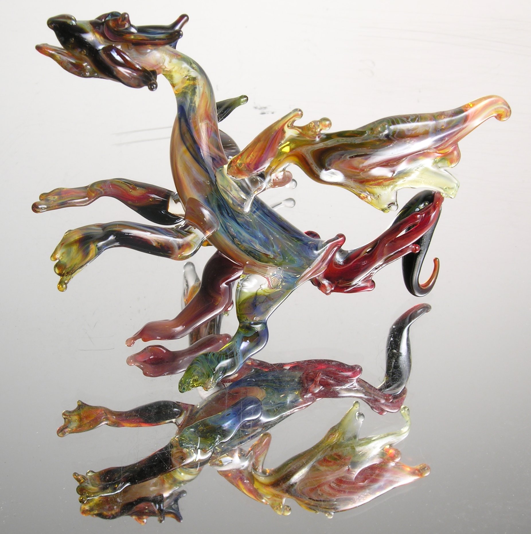 Legs I usually just add directly to the stumps, though I leave the toes/claws for later. If I'm lucky, I manage the heat-pull out thing I discussed a little in yesterday's post, but usually I add glass using a technique called ‘wiping on’ (you can wipe off too), which I think of in terms of painting (but with viscous paint!) —not surprising, since my college training emphasized drawing and painting. I generally put the head on roughly at the same time as the legs, form its little projections—jaws, horns, etc—then go back to do the same (e.g. paws) on the legs.