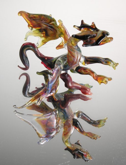 After I pull out a mass in the spine (and if I'm lucky manage to shape the tail as well) while it's still nice and warm I add stubs to it for the protrusions: that is, the wings and legs, and melt them in well. The reason for doing this is that finishing a wing or leg, and then going on to the next is that, eventually the body will have cooled down so much that adding a bit of hot glass will shock the larger, cooling mass, causing it to crack.