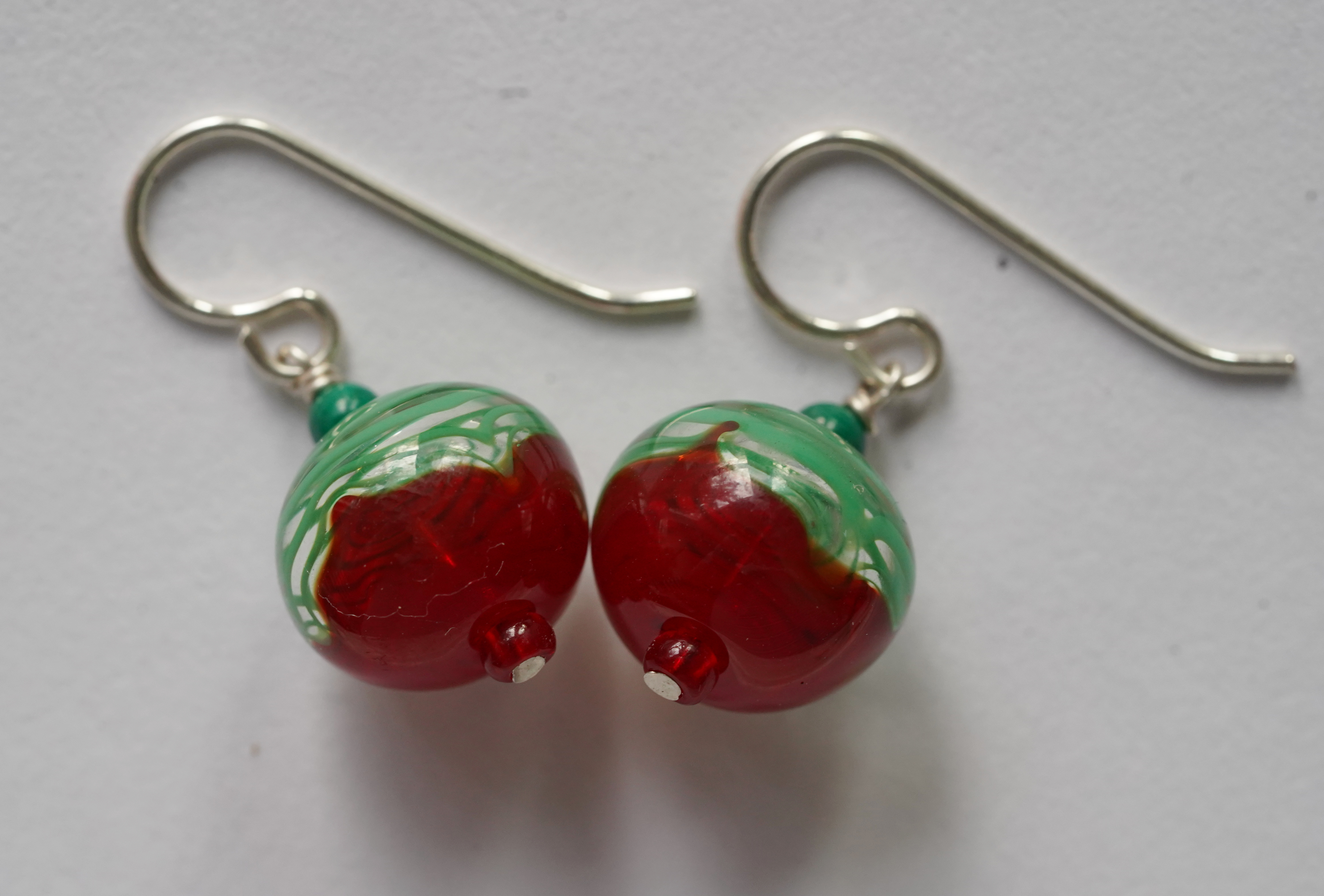 Earrings, lampwork, seed beads, sterling silver; photographed 20dec22. Sony A7c, 90mm macro, 1/100s, ISO 1600, f/8.0, ev +0.7