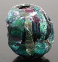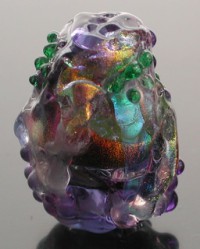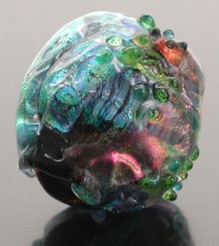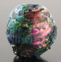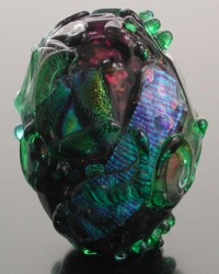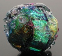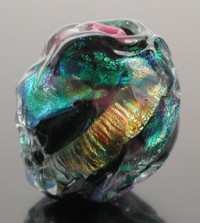 At 32x28MM, this bead is a little smaller than some of the others, but one of the most heavily dichro'ed, with mostly solid layers of green, gold, fuscia, blue and violet dichro. The dichro is slightly burnt (silvered) near one end; holes are decent. Trailed with clear. Nevertheless, a personal favorite owing to the density and layering of the dichro.