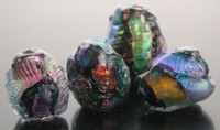Dichro comes in many colors and patterns, and in these beads, I use ’em all. Like most of the beads I make, these are hollow, though they start out as slim cylinders before I add three to four layers of glass, sometimes with additional decorations of two or three kinds of leaf, reduction frit, and of course, dichro. Lately I've been softening the dichro with pixie dust.