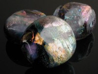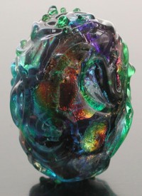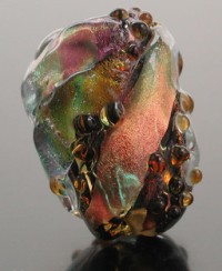 Having gotten over its initial bright ’n’ gaudy phase, the art glass bead movement seems to be heading towards more subtle effects and colors—browns and greys, matte, rock-like surfaces, dull copper or silver staining instead of brilliant gold leaf.
