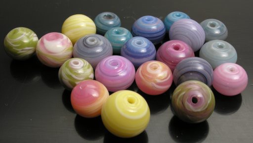 I wish I could say that I have a quantum leap in my ability to make striped beads, and though I think I've improved, the reason the satake beads are not up to snuff (or at least the excuse I choose to believe) is not that I've gotten so much better, nor even the time-honored excuse that I wasn't used to the low viscosity of Satake (though it no doubt played a small part) but that I made these beads on a hothead, and I'm not very good at it.
