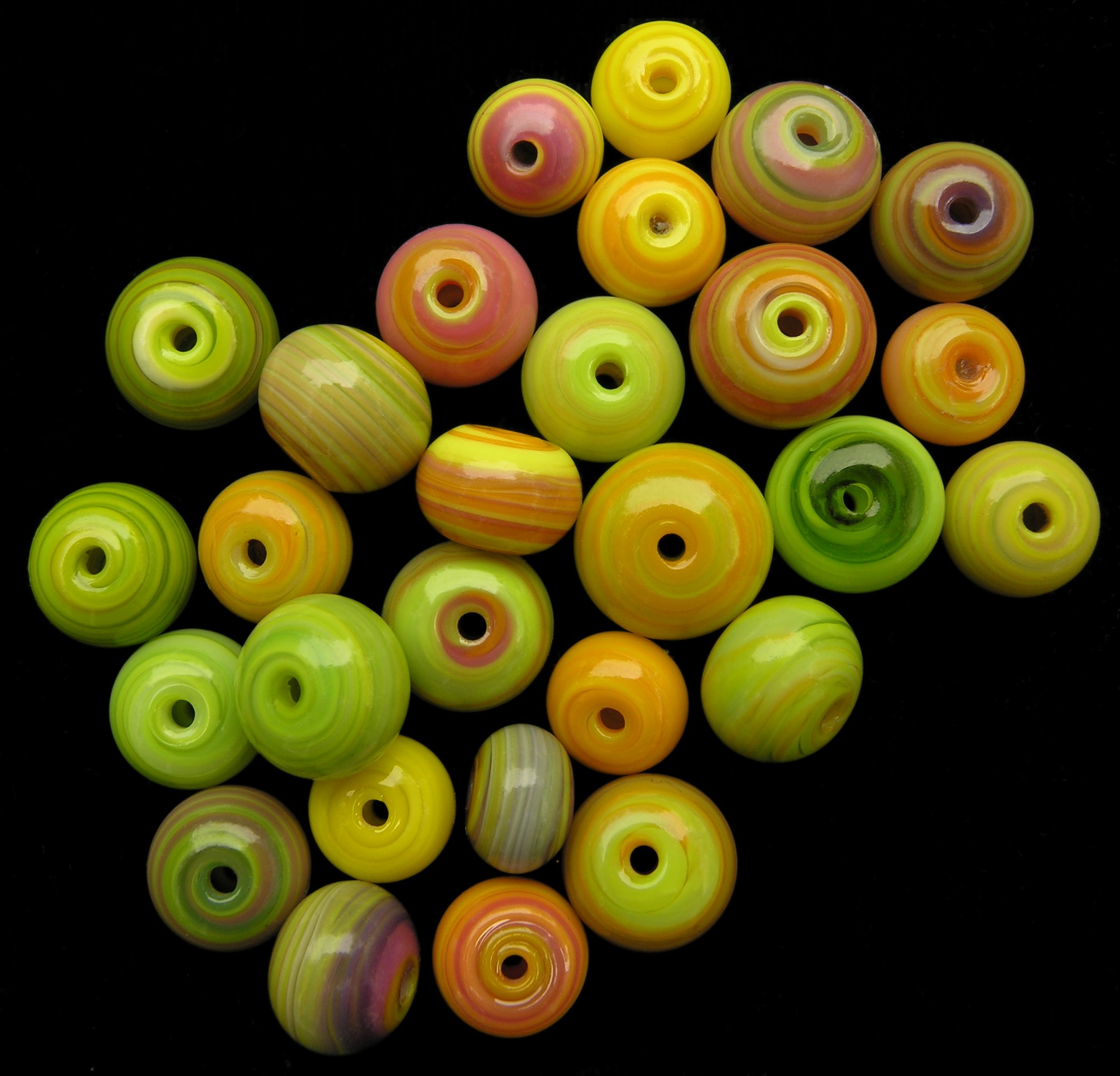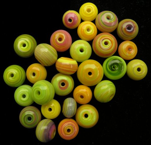 ...heavily image processed. This was something of a lark on my part. Ideally, highlights and shadows should be even and regular, so as not to distract from the subjects. Unfortunately, no matter how many times I see trees, the camera, the photographer, etc etc reflected in pictures of beads I take outdoors on cloudy days, hope springs eternal that I can just quick'n’easy set ’em up on a table and snap a quickie without having to mess with lights, backgrounds, mounting the camera on a tripod or copystand etc.