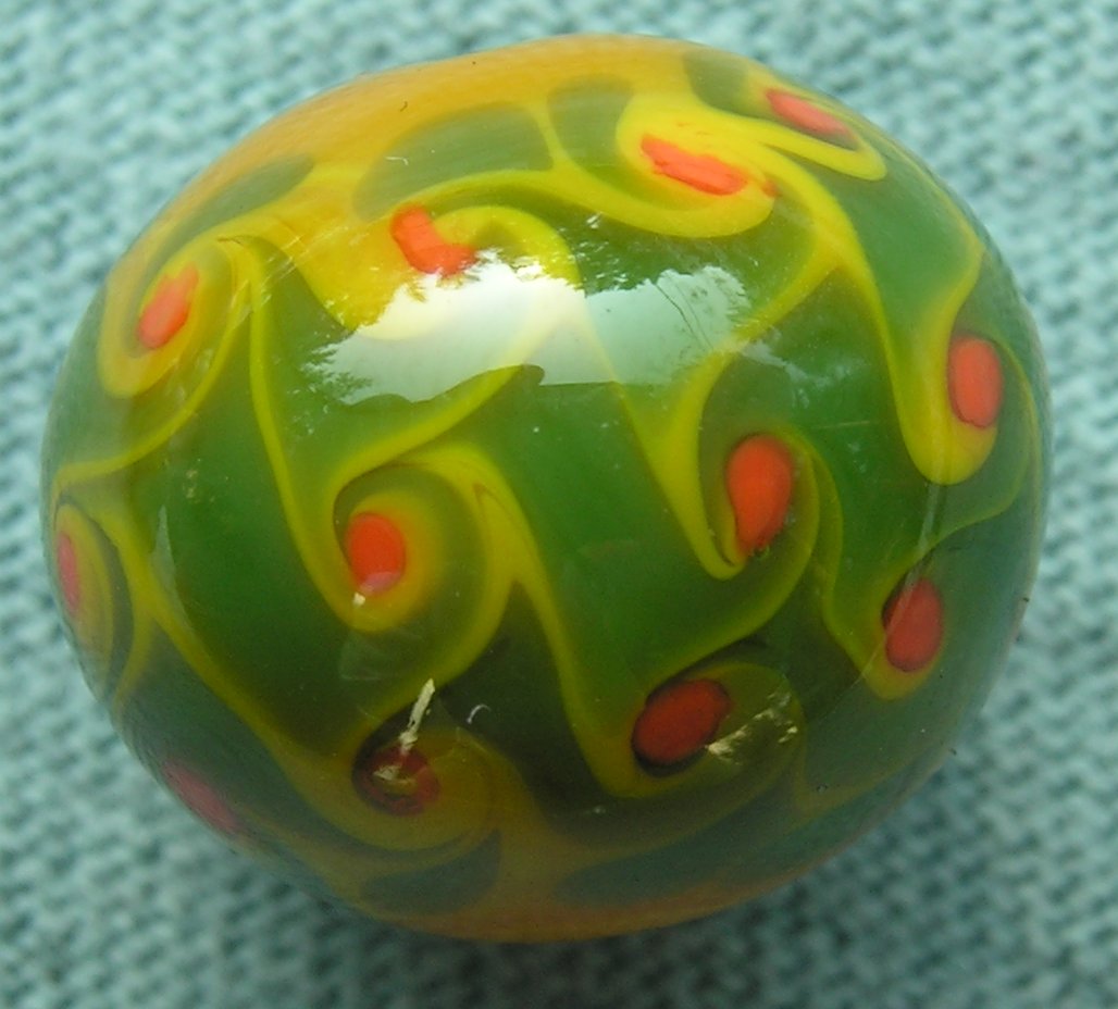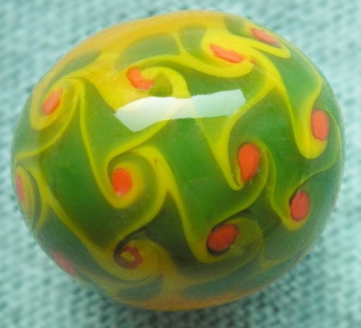 I was relatively happy with the way the color worked in this bead. Interestingly enough, looking at the full-size image, I note that the green separates at the boundaries some, taking on a olive cast at the edges. I also discovered that shadows, at least on glass, tend have a thin, dark boundary which is a visual, rather than chemical effect. So when I was attempting to clean up the highlight, I actually took a drawing tool and drew in this darker edge on parts of the highlight. (See especially the top edge.) Note also my wretched job blending said greens in the triangle just above the middle top of the highlight. Lousy. (Not only that I screwed up and threw away the full size version, after degrading it by saving it as a .jpg about 5x in a row; so now I have to stop screwing with this. Moral: always save in non-lossy native format; then save off the .jpg...)