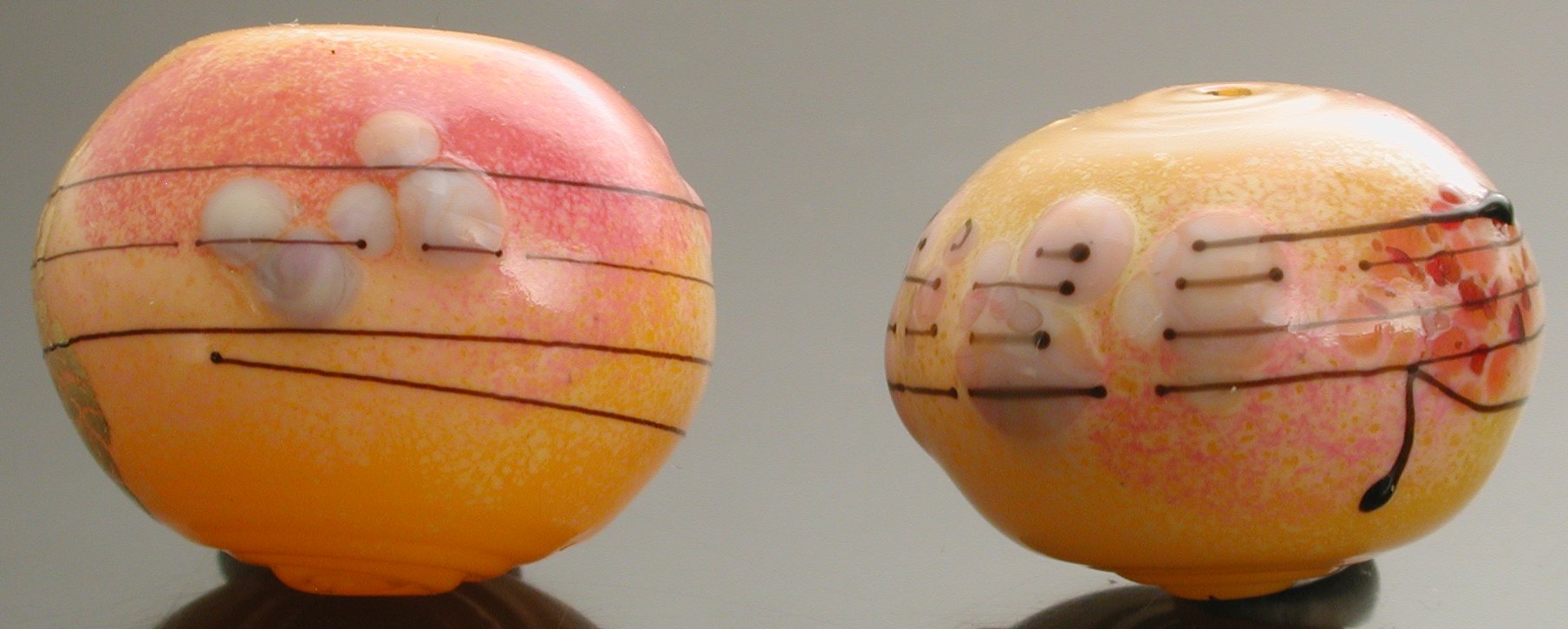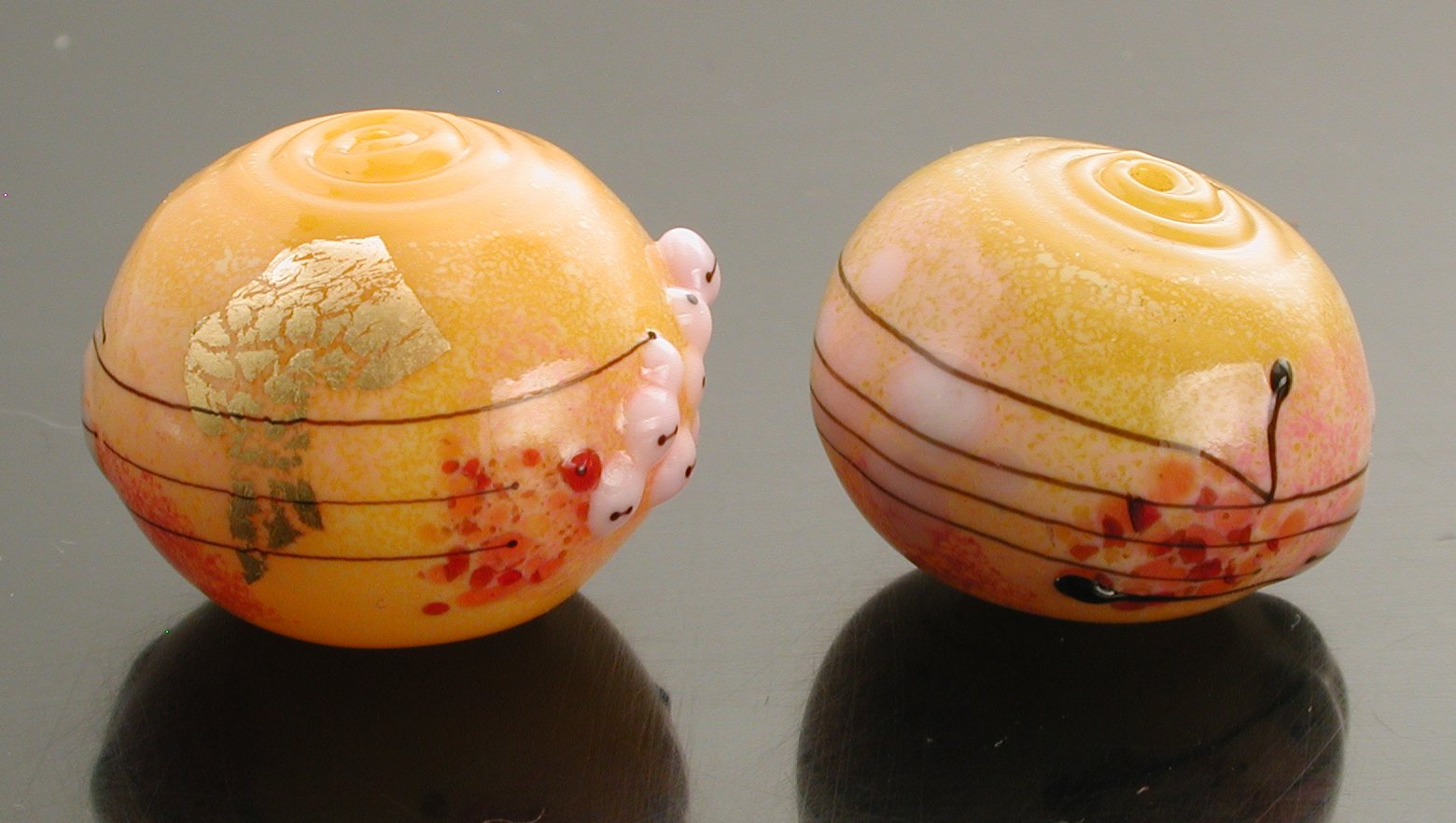 Both the beads, chiming hollows, are made on semi-translucent 408 effetre yellow, with the following thompson enamels: