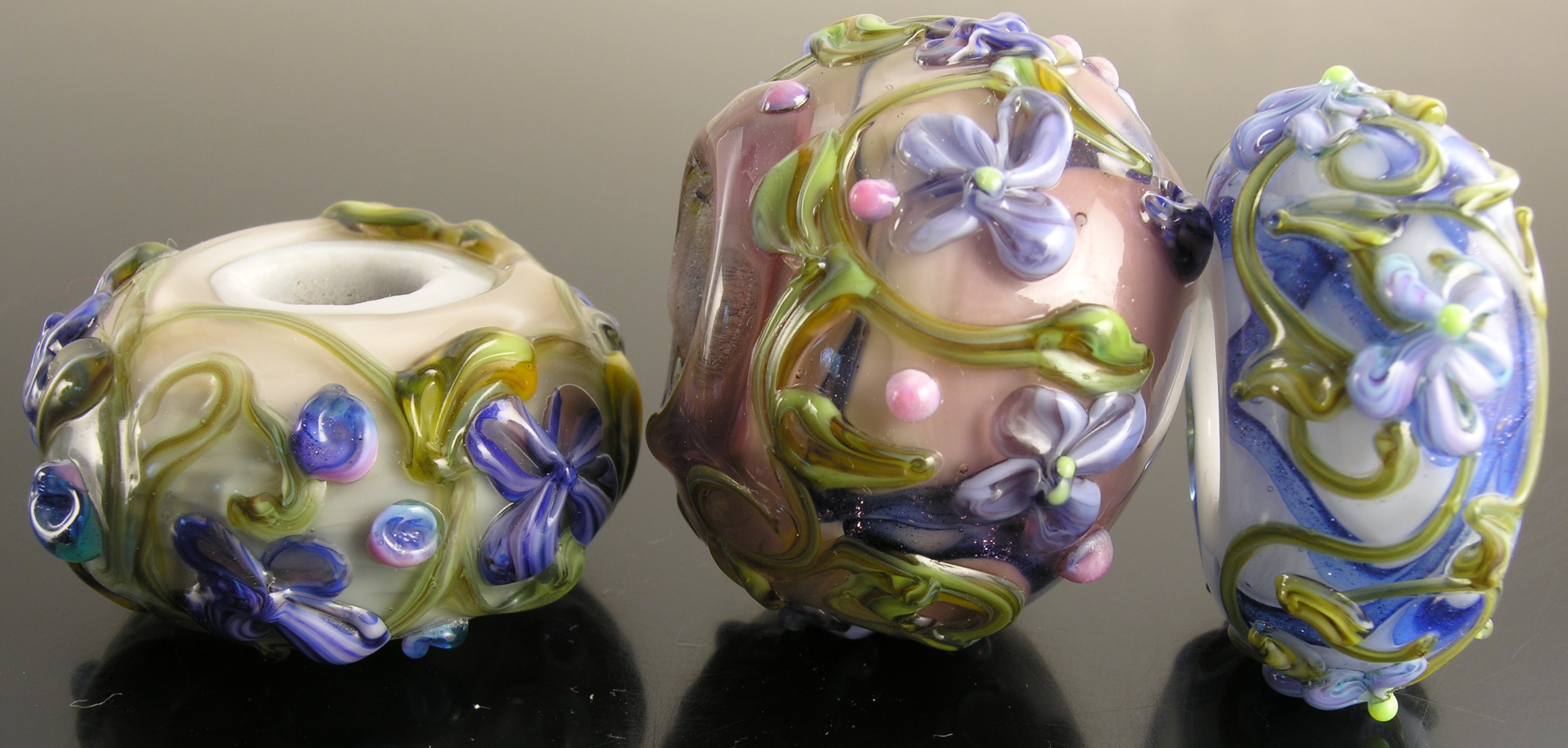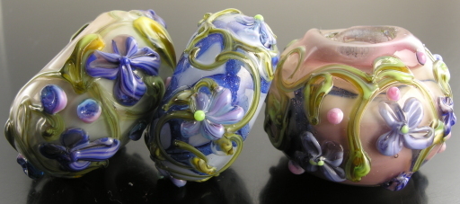 Good. Or at least, better. As noted above, the lower front parts of the beads is a tad on the dark side. 3 bighole beads, completed sometime in 2007. Cased, with blue-goldstone stringer, and trailing. Effetre. Largest is perhaps 25x35mm.