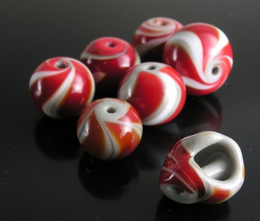 Gravity swirls can be made either solid or hollow, but obviously it's a little trickier to make ’em hollow, because if the glass is heated too much, it can collapse onto the mandrel. This is obviously what happened to the "shell" bead depicted here, and what I particularly like about it is that the glass wrapped itself around the mandrel, making a core reminiscent of real shells. The difficulty, of course, is that I can't really control the collapse and subsequent holepop to recreate this type of bead on a regular basis.