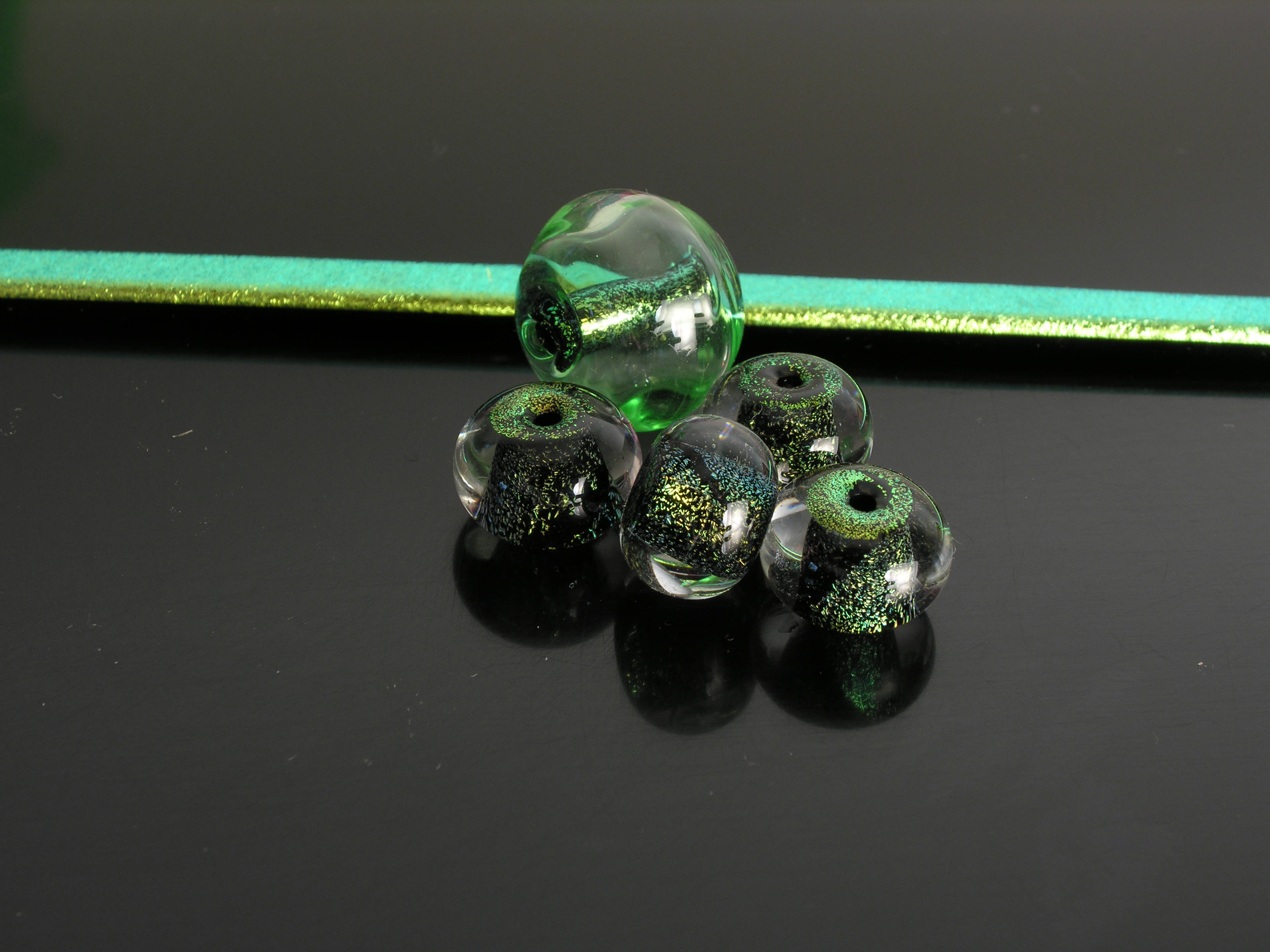 solid cased and jacketed hollow green dichro beads shown with source strip. Effetre, Photographed 18jul2007.