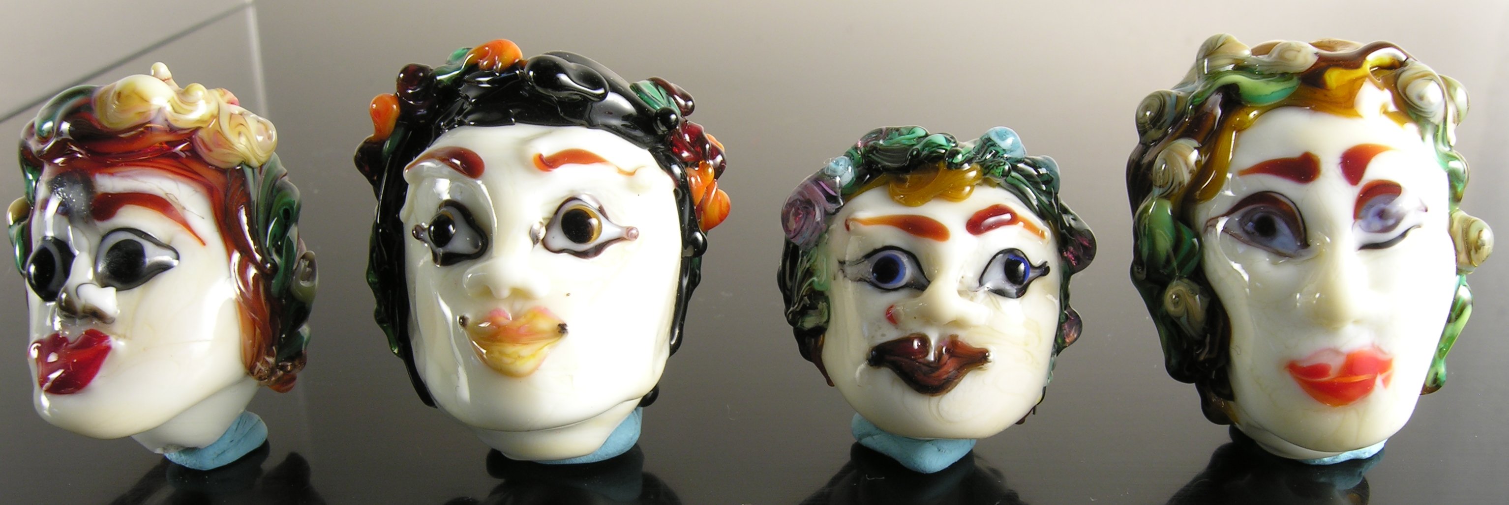 The black dots at the corners of the lips of the black haired head was the tipoff: I'd plucked away the casing glass, allowing the interior lip color (opal yellow or silver pink) to just touch the ivory—and viola, sulphur reaction. The lips on the bead 2nd from the right was made with red cased with gold ruby, and they turned that icky color for similar reasons. The bead all the way to the right cracked, but I was able to detect (and so fix, or at least heal) the crack before it went into the kiln.