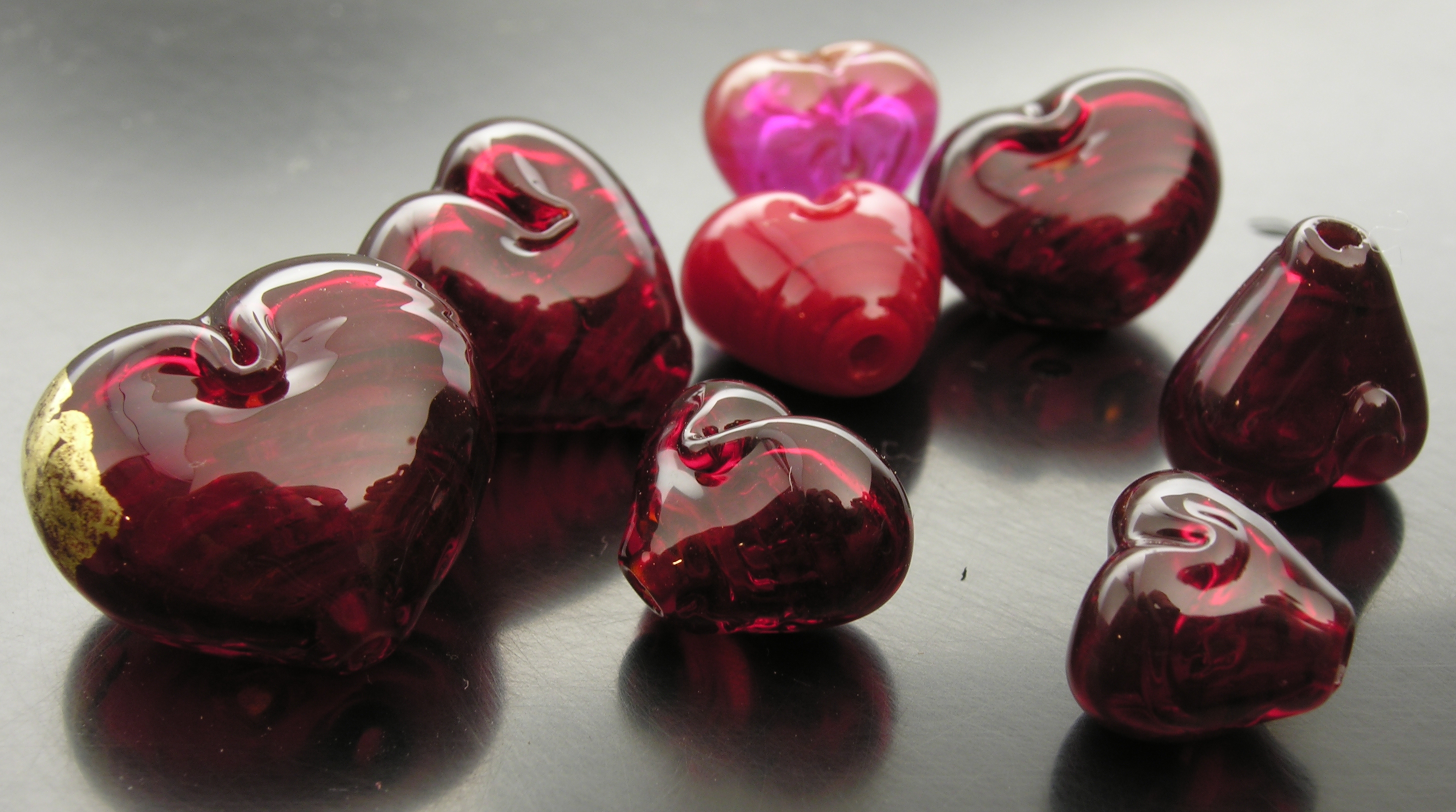 I took several versions of this photo, selecting this rather dramatic, if not particularly informative from a product selling point of view, image. But hearts should have a little mystery, no? Hollow heart beads, 21jan08, czech and bullsye, 1/16” mandrels, roughly 10–16mm top to bottom.