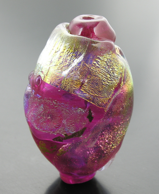 lumpenstyle focal made with check glass tourmaline pink and 104 dichro. That honking big crack illustrates the problem, for which I made this bead to drive home to Page that, alas, the other was not a fluke. Shot 22jan08.