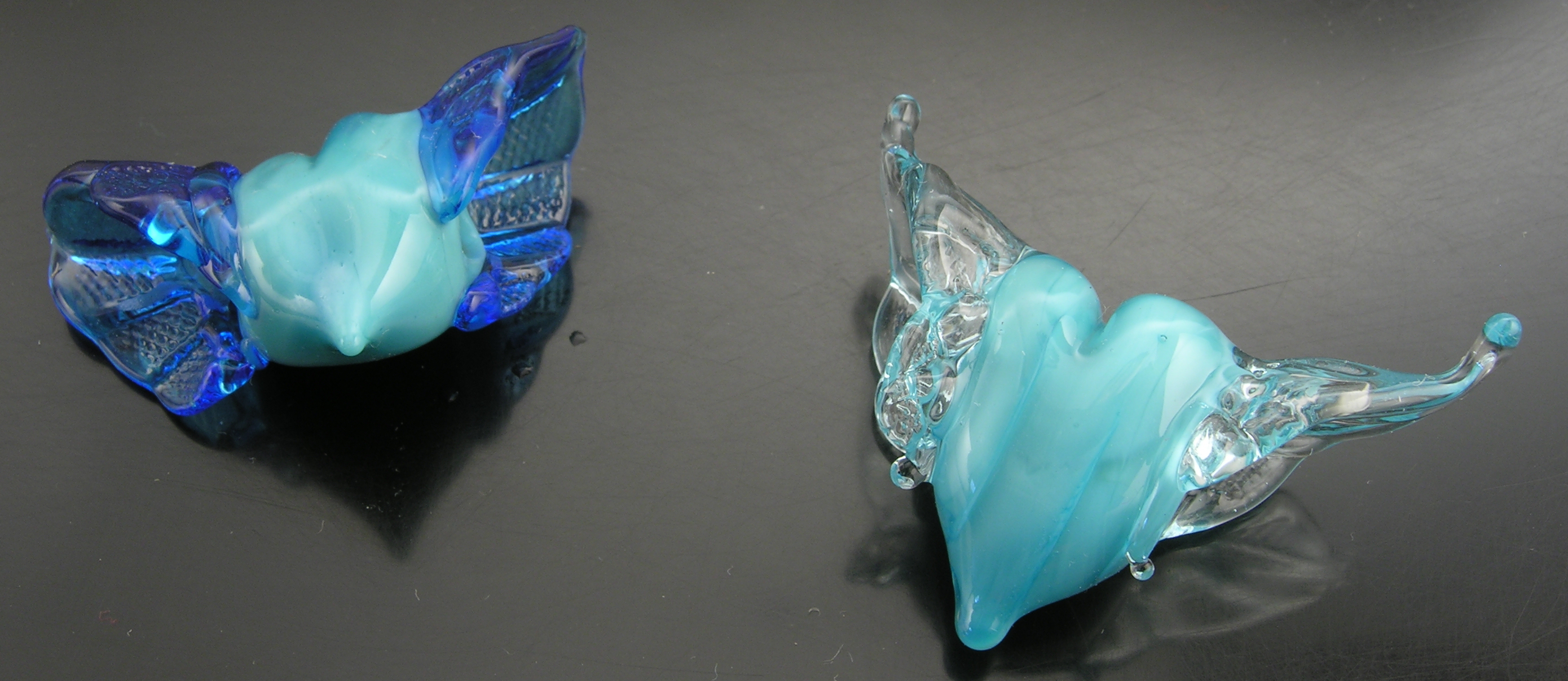 I used special fancy odd lot Effetre from Frantz, but it looks pretty ordinary in the bead. These sorts of greenish-blues are her colors. I cased the one on the right, to give it more thickness to help prefent holepops, possibly also to prevent reduction (that lovely gray scum to which the opaque turquoise family is so prone) and maybe also because I felt like it. Obviously, casing is not my strong suit.
