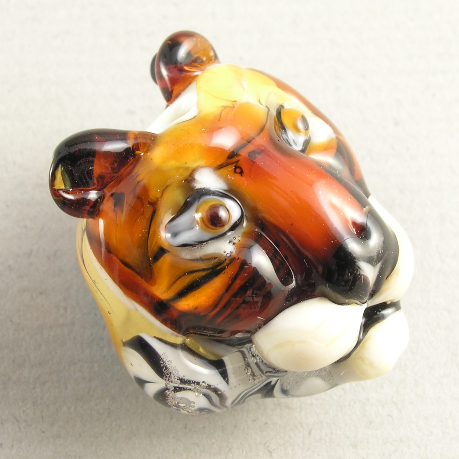 Most of the animal head sculptures I've seen have tended to be focal sized beads of 1-1/2 inches (say 40mm) or so; the first three tiger heads I made after attempting Joy Cichewicz’s tiger head class last year were roughly in that size range. But for whatever reason, I decided to make this one a little smaller, and I think it came out better.