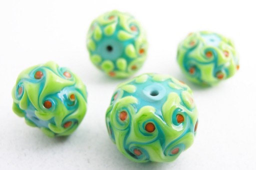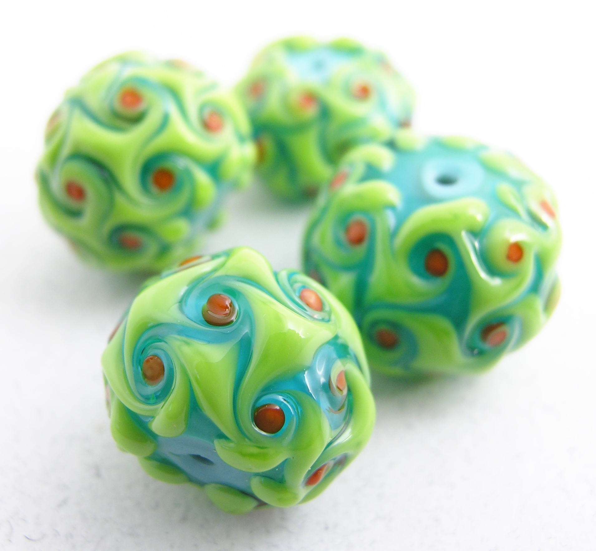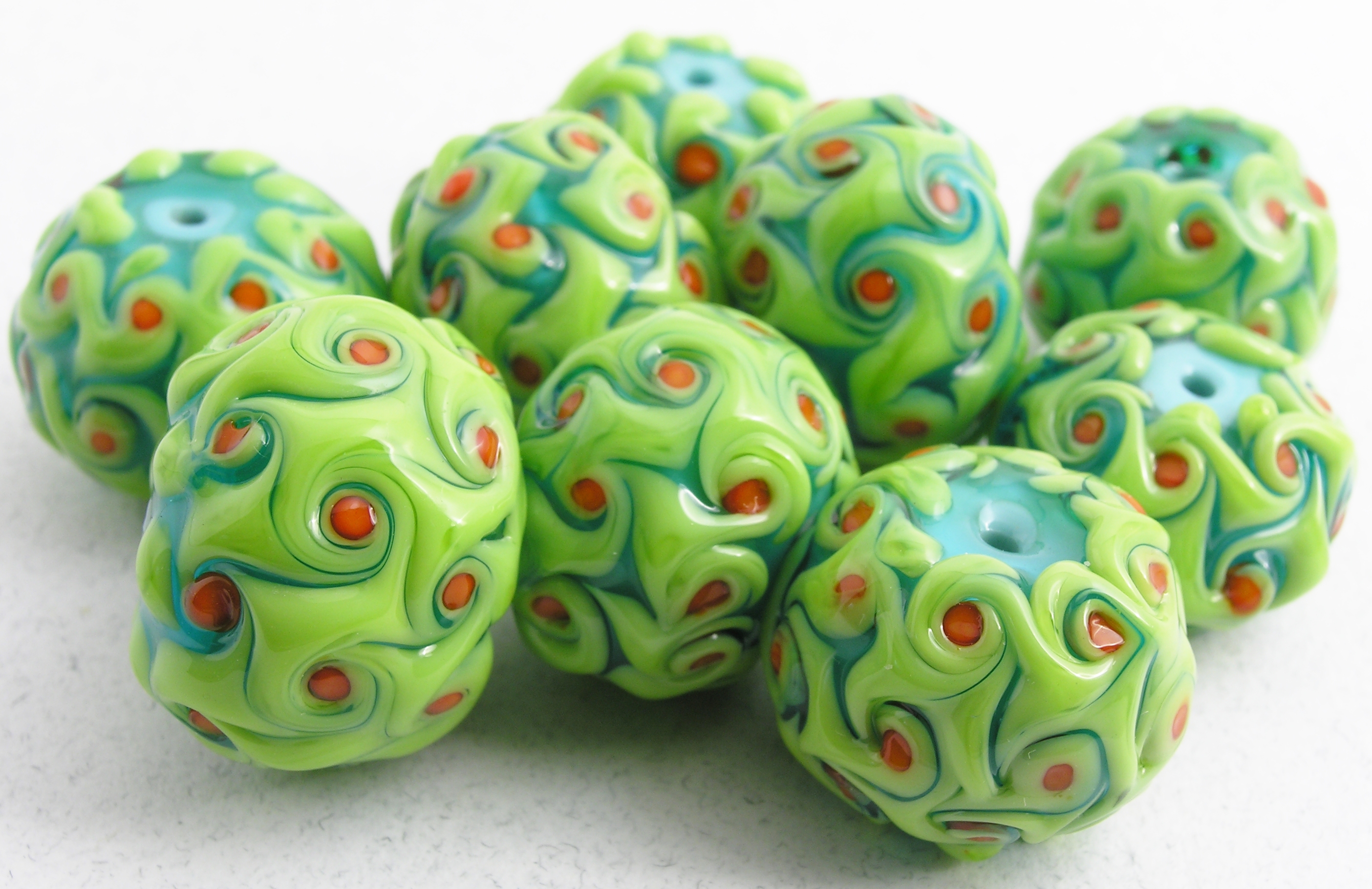 These beads are made with shorts, that I have a lot of (to use up. Always, the using up, with me. Sigh.) I start with an opaque turquoise base, cased with dark trans aqua, dotted with pea (or whatever lime is called in the effetre palette) and twisted with orange. And yes, I pull out a stringer from a full size rod, as that gives me considerably more torque.