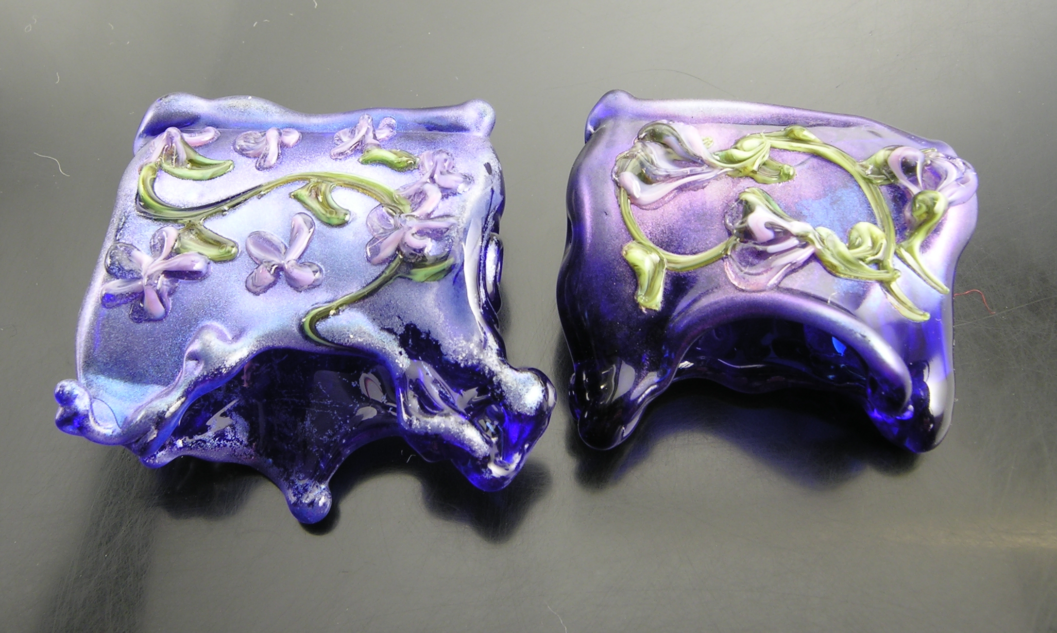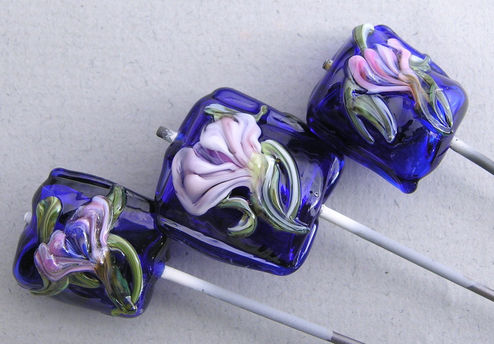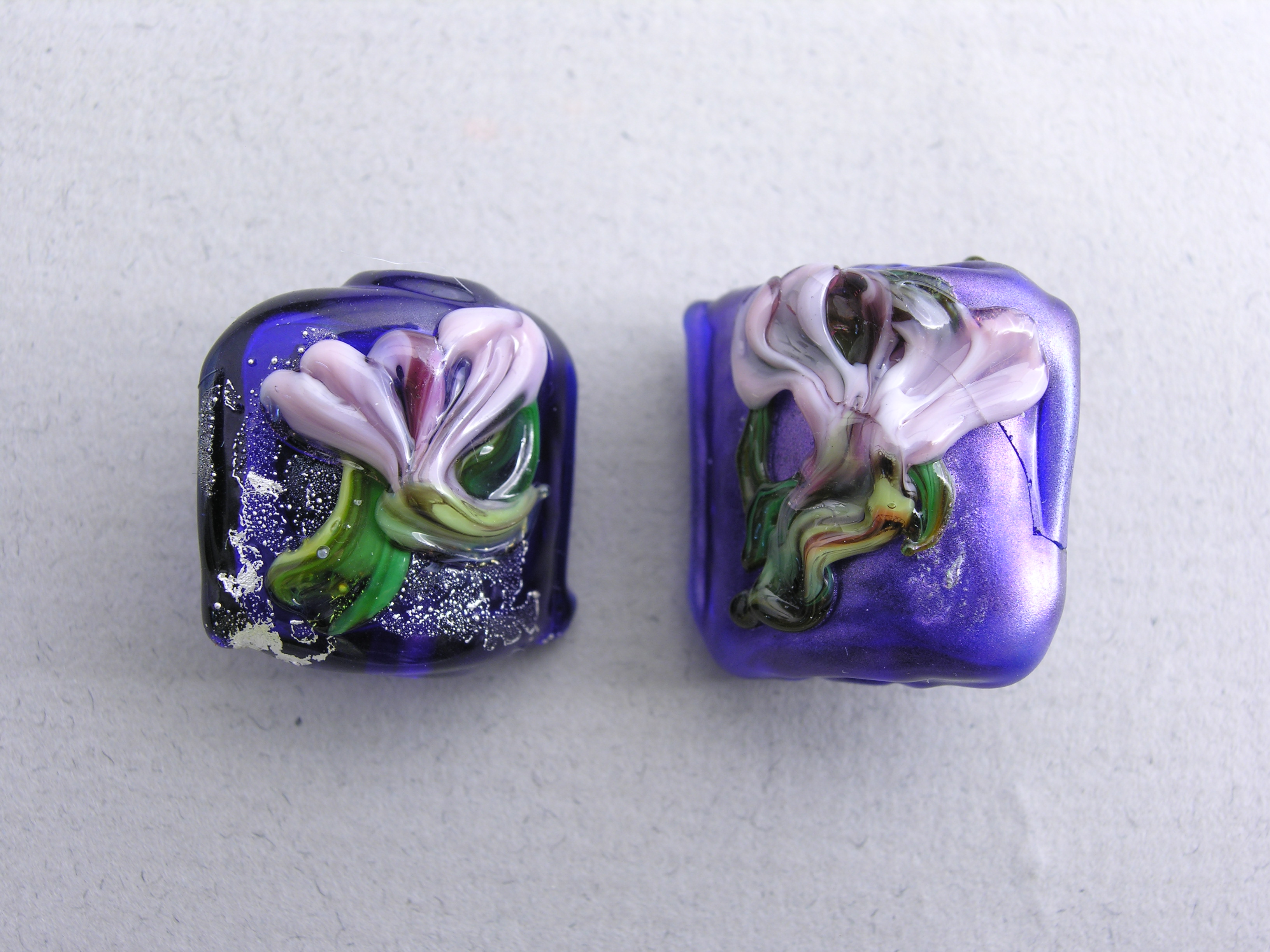 According to my studio notes, I probably made these beads 5Aug, the same day I photographed them. My notes on the floral cane are as follows: