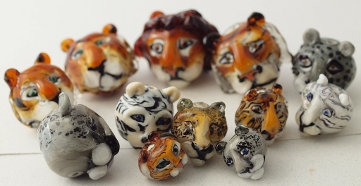 an assortment of animal head beads for B&B. Hollow, with assorted stringer, thompson enamel, and frit decorations, clear cased. Spring 2010.