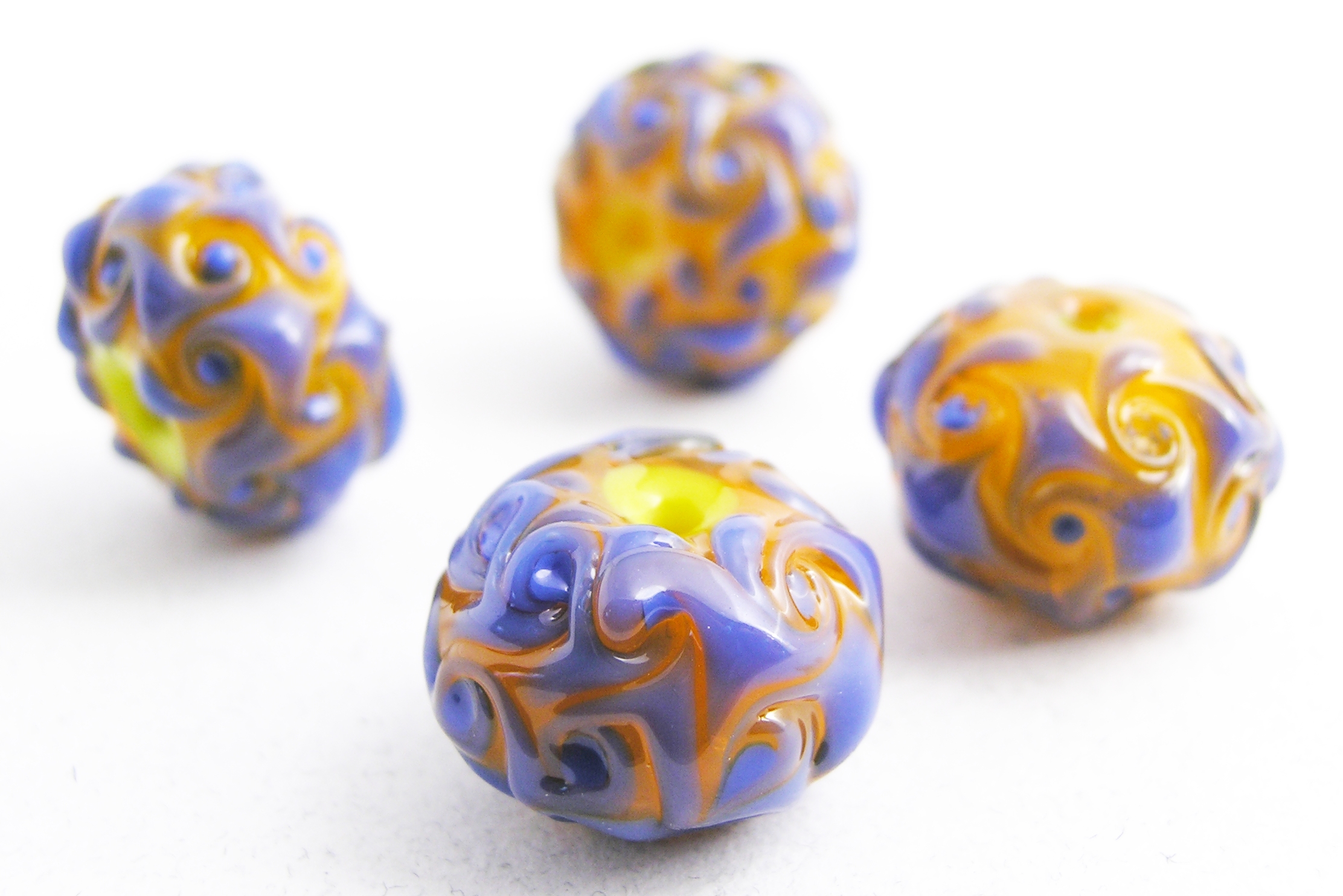 4 harlequin/twisted dot/tessellation beads. Leftmost bead is 11x18mm. Cased, trailed, hollow, pi or uroborous (or a combo) 96 glass lampwork beads, late 2009 or early 2010.