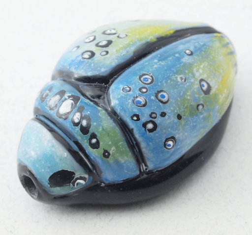 The piece above was made during a Margaret Zinser class or perhaps shortly thereafter[1] At the time, Ms Zinser's working method was to shape the basic bead—say, a butterfly wing, or beetle, as shown here, then paint white china paint, then color china paint. This resulted in a thick layer of pigment, which was problematic, because the paint would sometimes pop off in the reheating process to bake the paint on—the bead has to be reheated to 1400 deg F. or so.[2] I reasoned that starting on white, (necessary because some of the colors are transparent) would be a more reasonable starting point.
