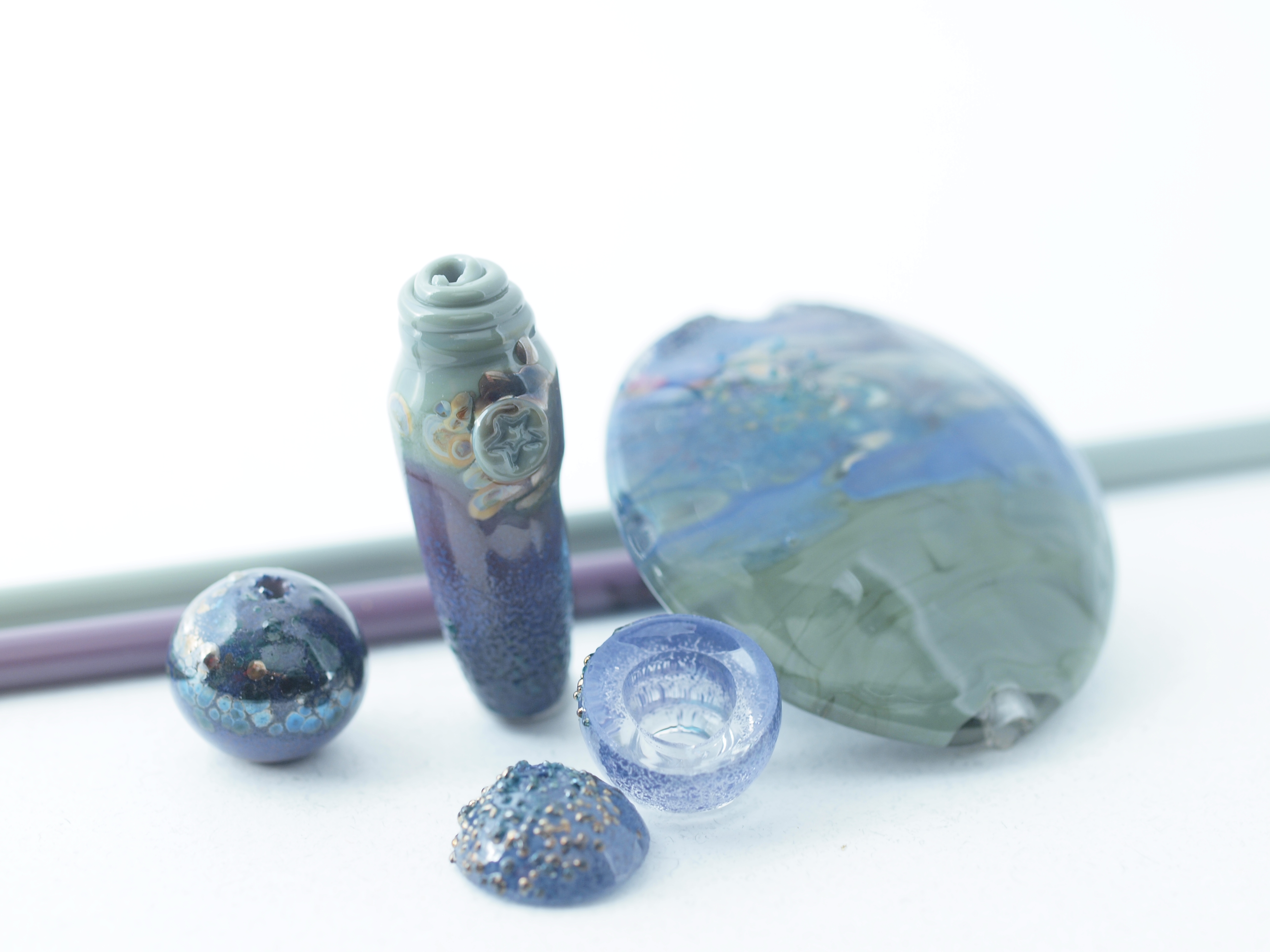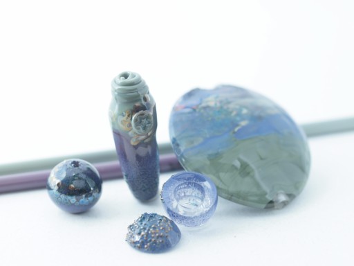 I gather this year CiM, in addition to donating glass for 40 bead challenges, also will be providing a pair of rods to be using in a monthly focal challenge. January's colors were commando and, um, purple.[1] According to my studio notes, I started my 40 bead challenge the same day as I completed this one—and a good thing too, as the 40 bead would prove to be extremely frustrating, so having this success under my belt probably helped considerably.[2]