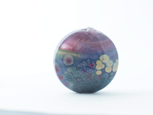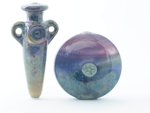 Stevi Belle vessel on the left. Early to mid 90s. 1.5 hollow pressed lentil, CiM evil queen, commando, raku frit, silver blue reducing powder, silver green frit other assorted TEs including, I'm pretty sure, orchid (i.e. opaque purple) This bead was made 05feb 2014.