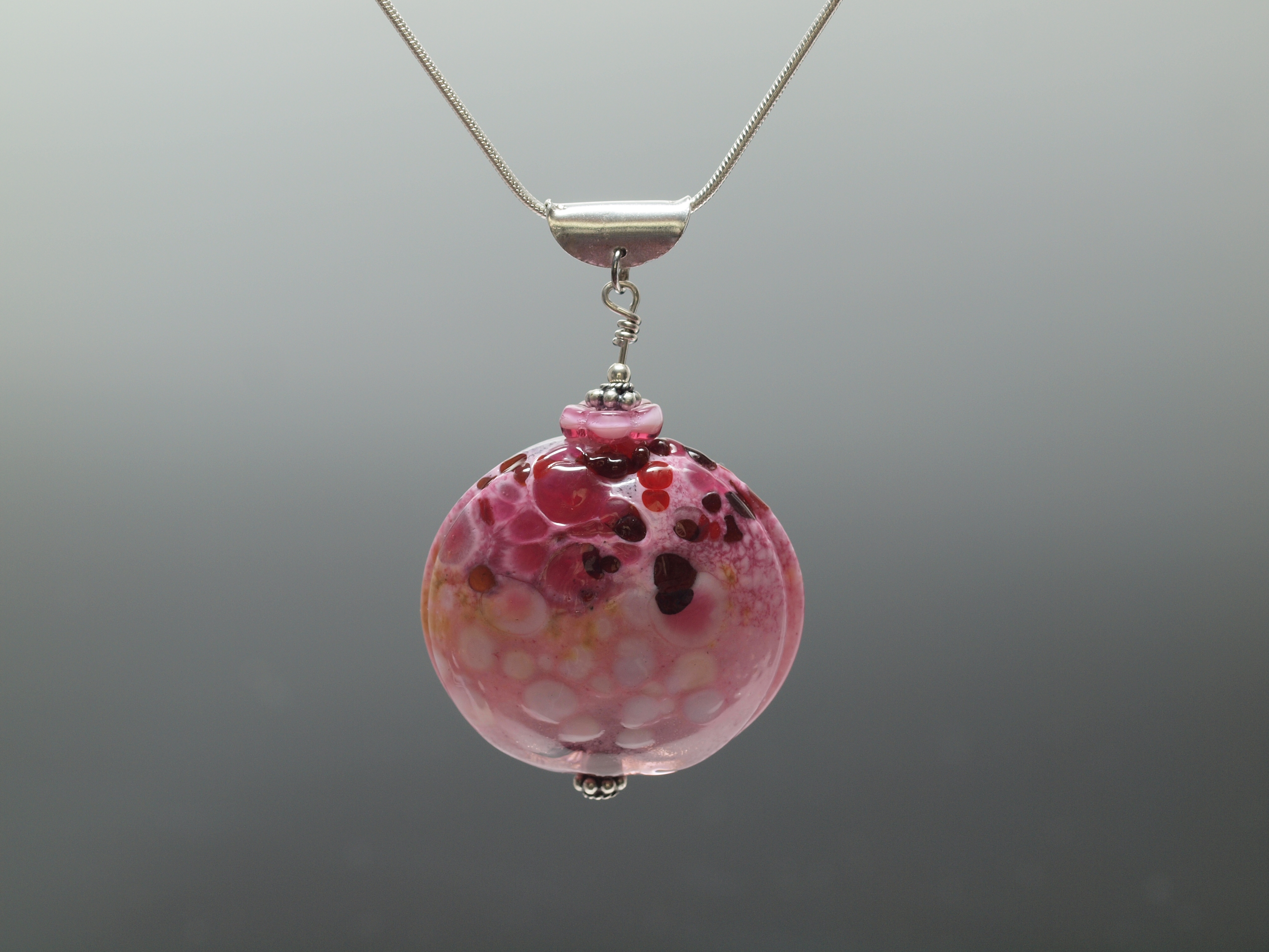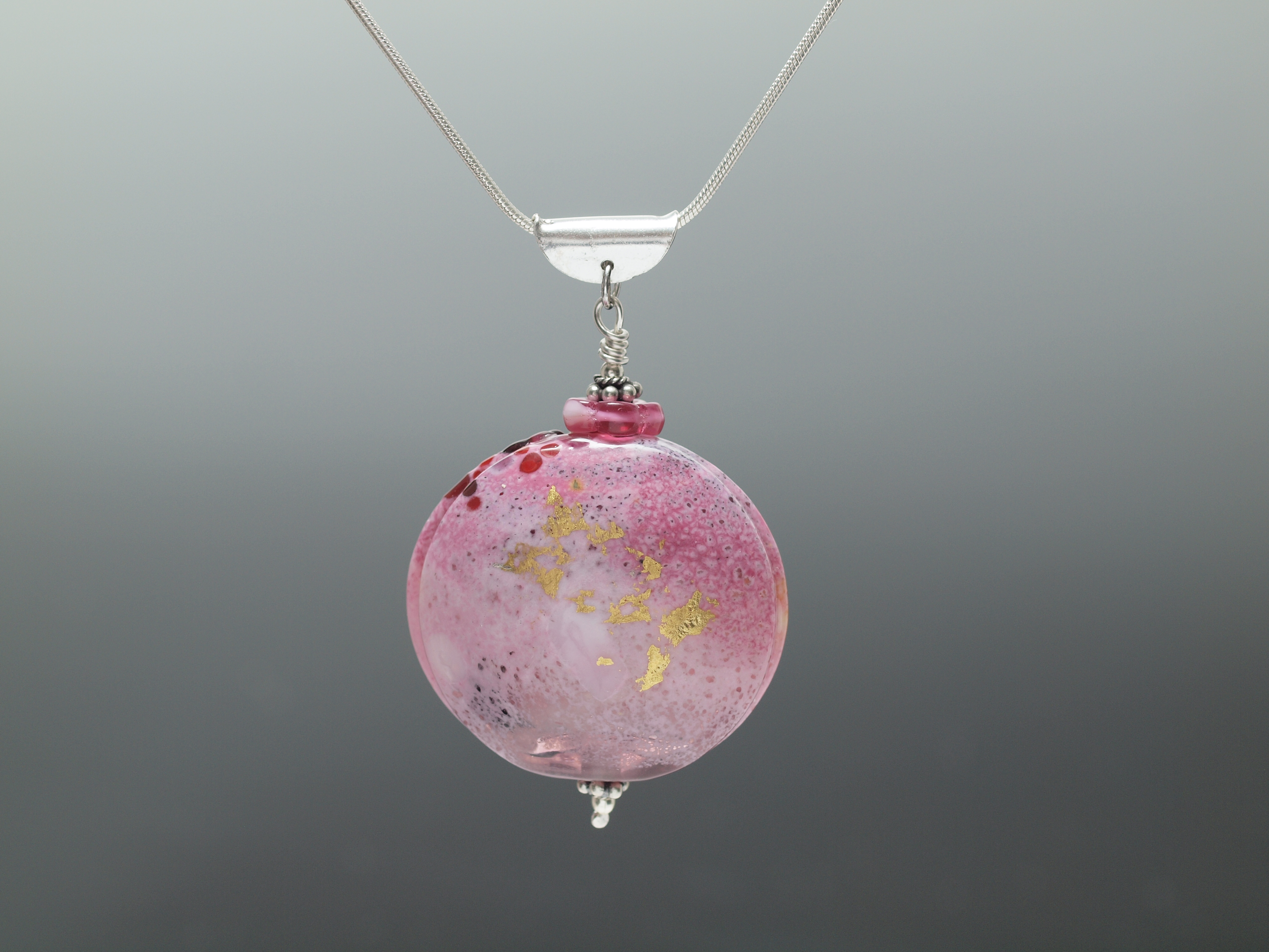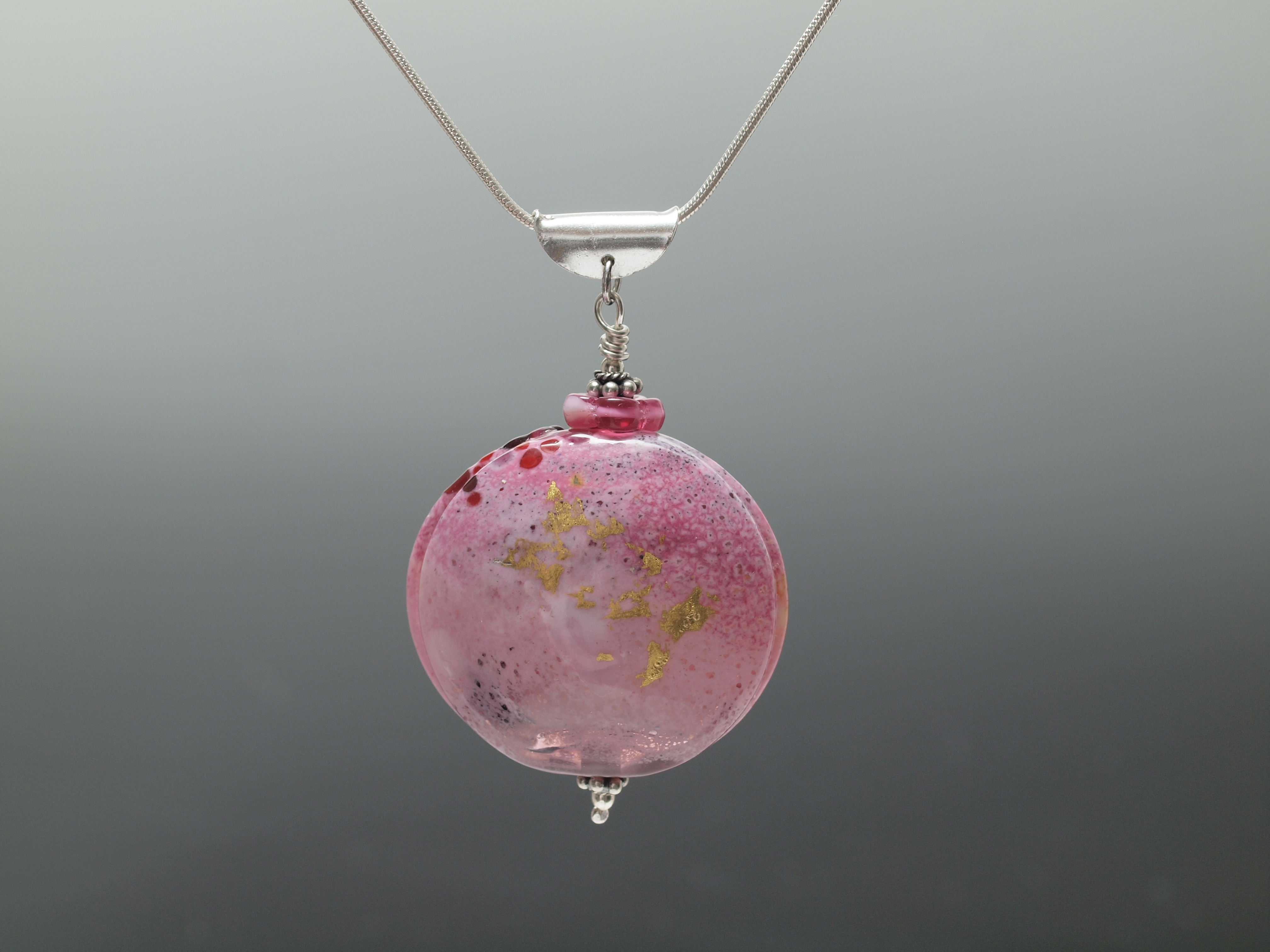 1.25 pressed hollow lentil with thompson enamels, frit & 23K gold leaf. Sterling components, accented with Czech pressed glass & Bali silver. 20jan2017