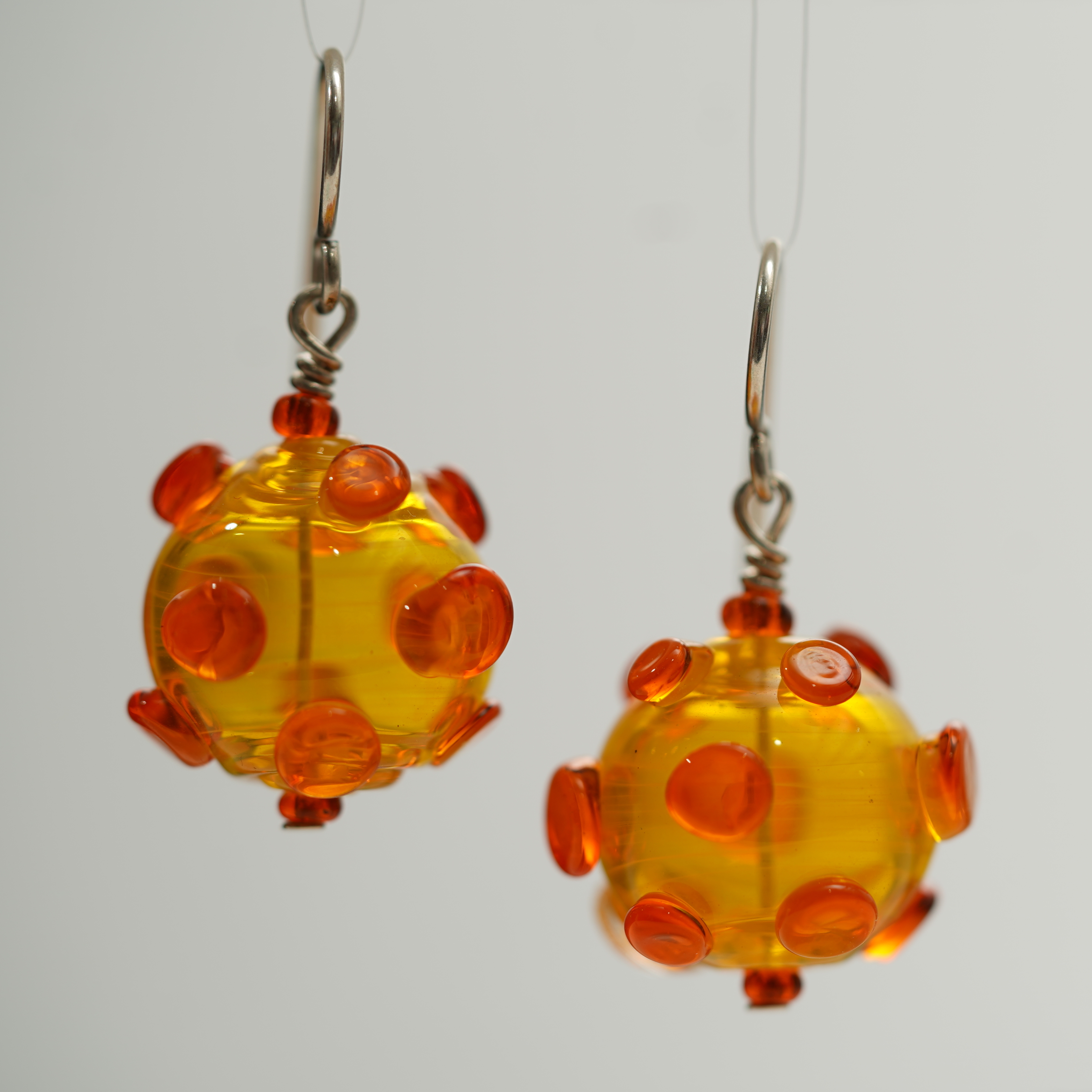 covid earrings, 2020; sterling silver, effetre 069 & 072, seed beads; Sony ILCE-7C, sony 90mm macro, f/3.2, EV 0, ISO 50, ummmmm godox at 1/4 power? —rotated, cropped
