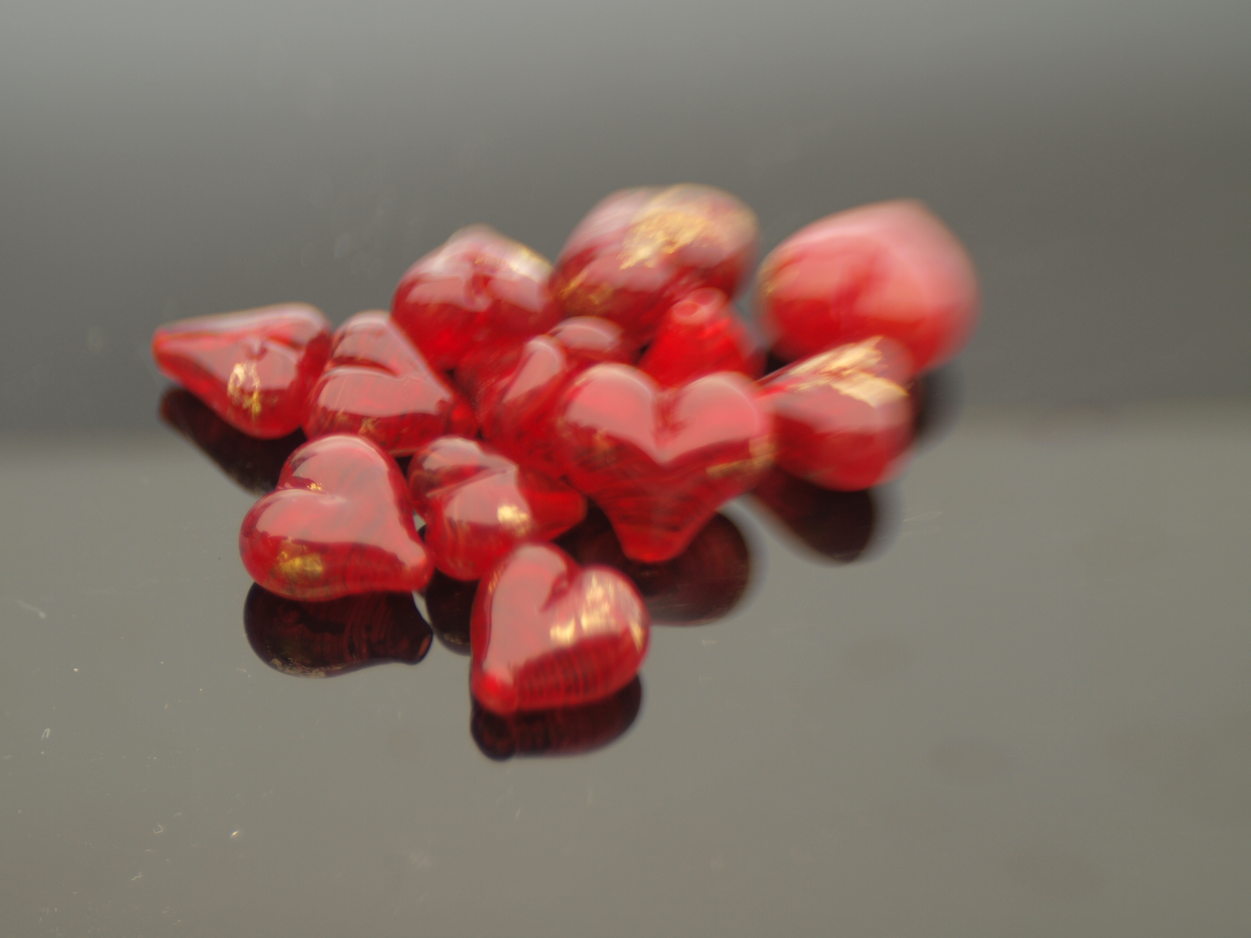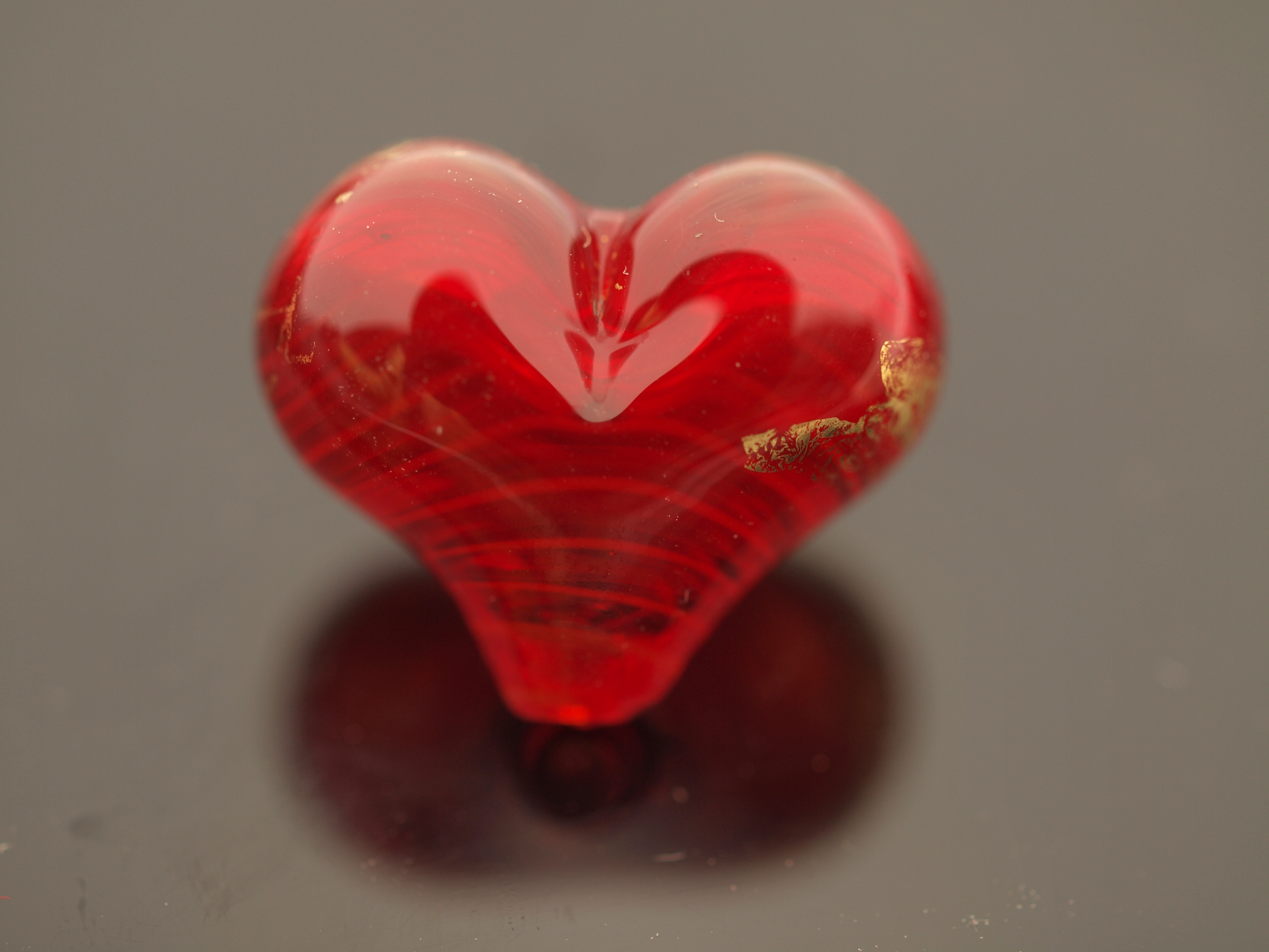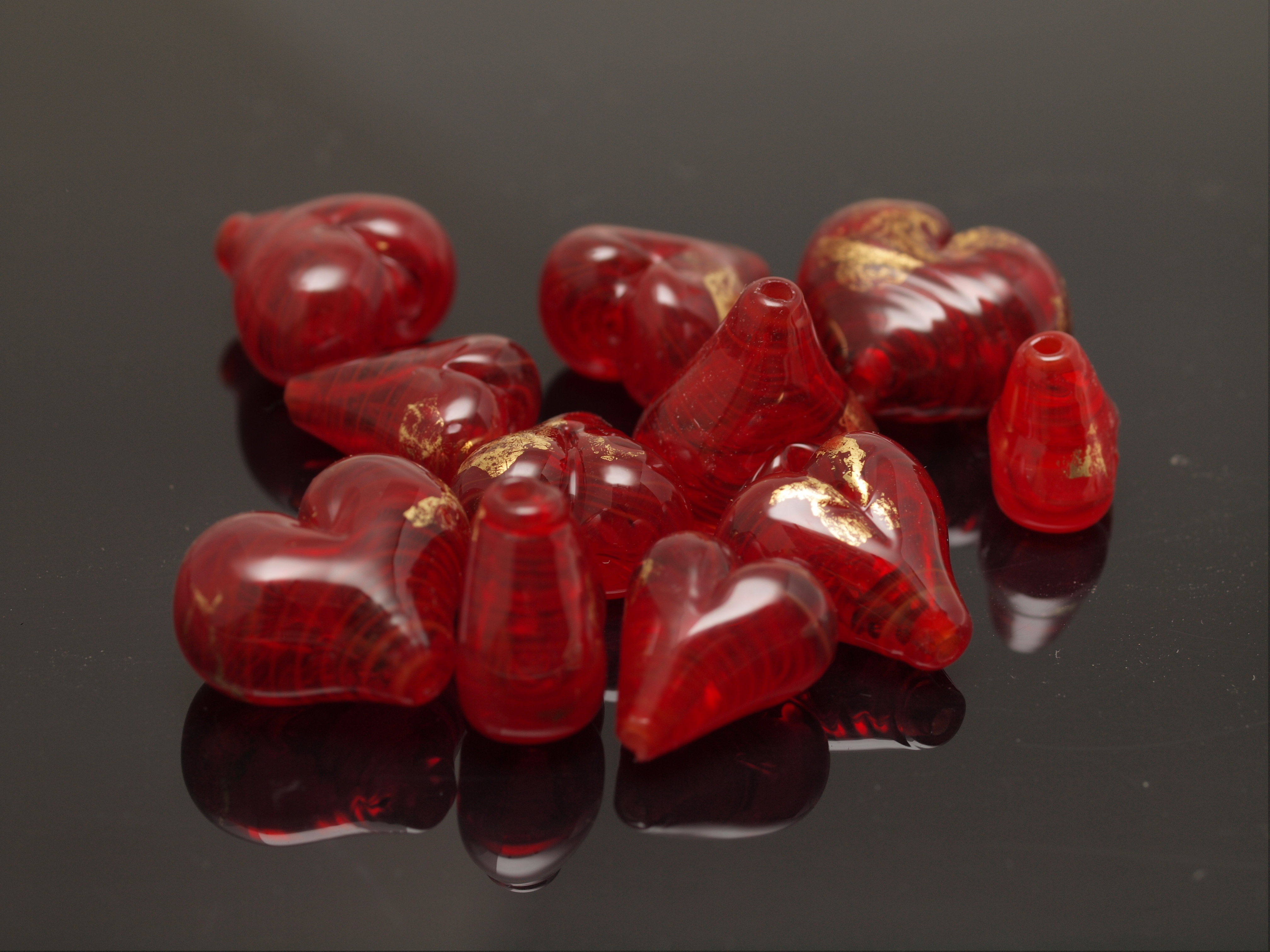 The final step was hold bead (mostly) upside down while heating the lobes to get them to puff into nice half-round domes. Et voila, a hollow heart bead. (Oh well, and apply the leaf, but that's pretty straightforward.)