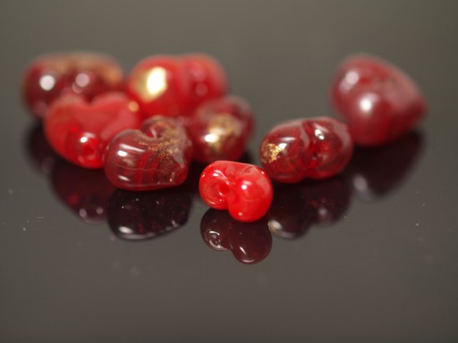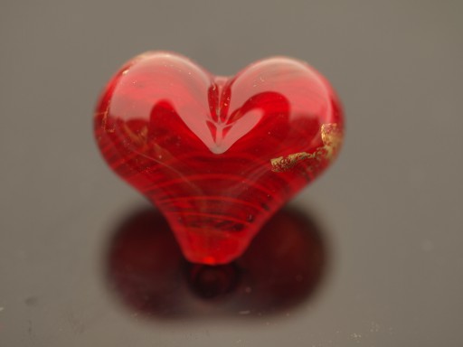 I found making small, repeated cuts or dents with a knife (or #11 x-acto tool[3] ), going back and forth from one side of the bead to the other, helpful in keeping the two lobes of the heart the same size and shape. Sometimes I dragged the tool towards the point of the heart to feather the dent or cut.