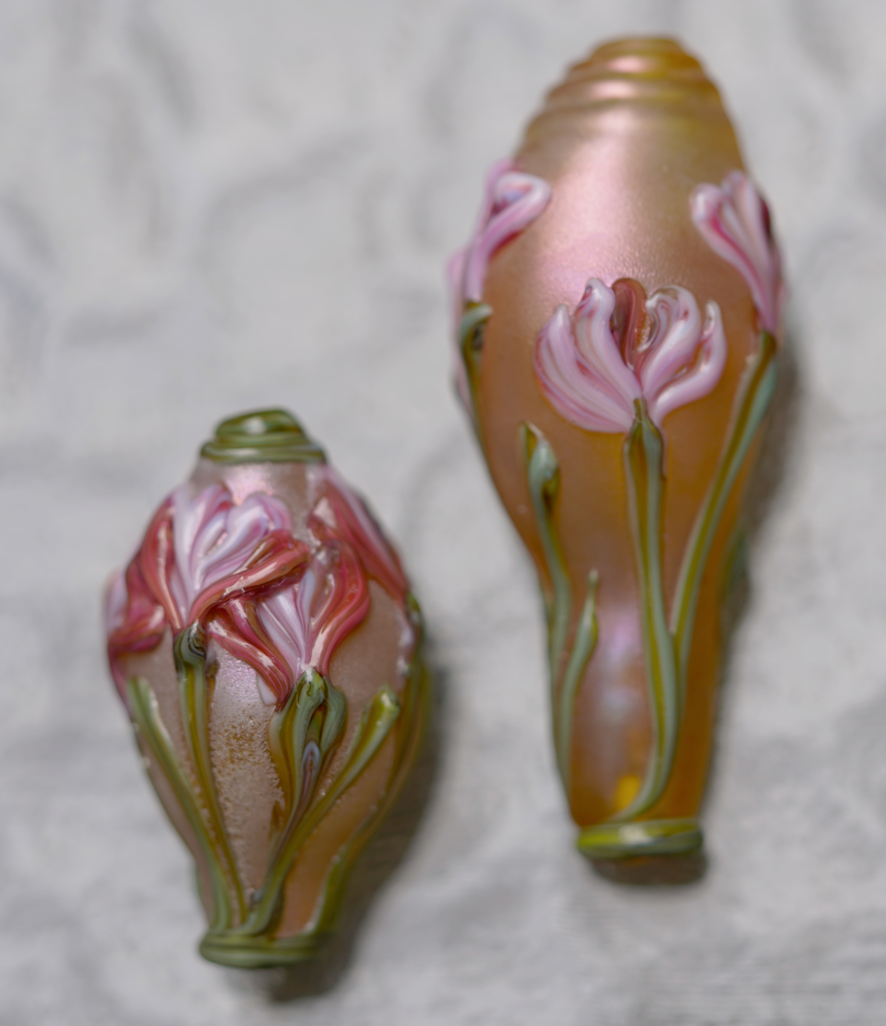 2 floral vessels on amber with red hilite pixie dust, 2jun23. Photographed 29jun23, sony A7c, sony 90mm macro, rotated, cropped, color adjusted in gimp.