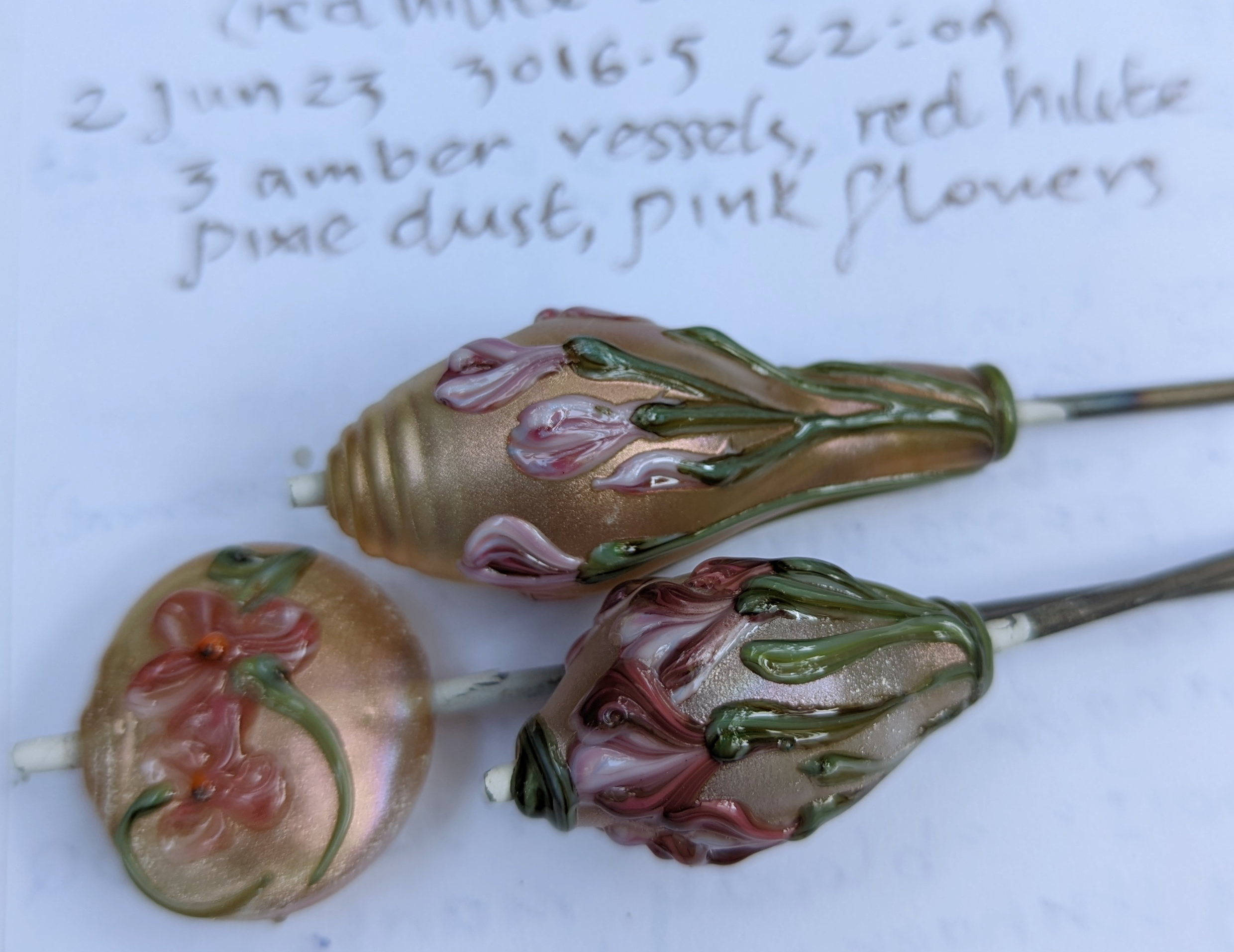 Purple flowers ought to look nice on amber—purple and yellow are complements after all—but after pulling the beads featured yesterday out of the kiln, it just looked black and dull to me. Also, I evidently had a little confidence (not entirely justified) that this lot would come out better, so I used more expensive pink cane for the flowers this time.
