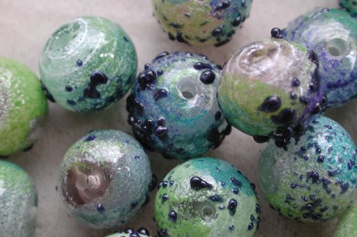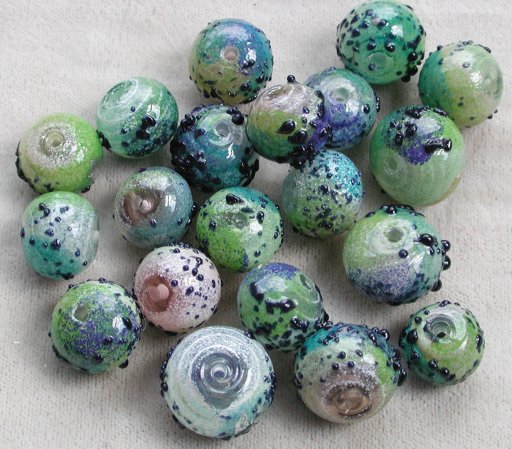 I tend to make abstracts during the warm months, because I need the heavy duty ventilation to cope with the dust. I made these during a brief break in the winter cold, to celebrate the coming of spring: a shop owner had asked for abstracts, but wanted something simpler than my typical designs which really are suited for beads 14mm and up. Besides new plant growth I was interested in using colors from my ‘neglected’ tray—white, tan, brown—and the blue goldstone, also in the same mini-muffin tin.