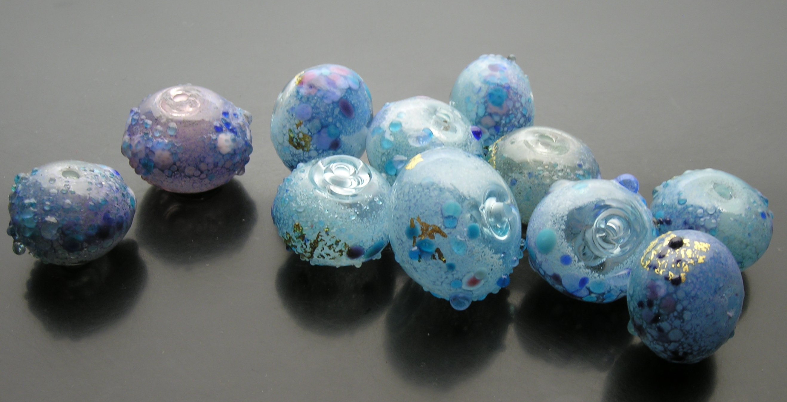 The 2 beads on the left are more purple (whoopsie!) and the two lightest beads from the previous series are shown on the right. Frit and powder chiming abstracts with white undercoating, thompson enamels, artist-made frits, gold leaf, largest 20x24mm. 25nov07.