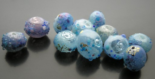 Time for me to learn, obviously. I wanted to give the beads a little zip (hueistic contrast) so I tried substituting pale pink frit for violet. Eventually I went back to the purple, but overall I was rather surprised at how readily the white and turquoise blues blended: Jennifer Geldard gets quite a speckly effect when mixing white and cobalt (dark) blue, and so I expected the same thing to happen here.