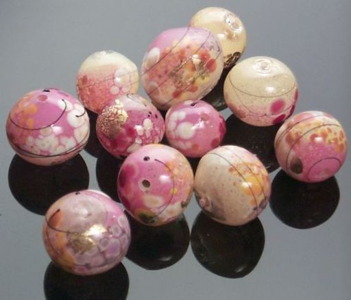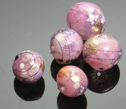 Frits, Thompson enamels, 22K gold leaf, trailing. The beads shown here are approximately 13–18 MM.