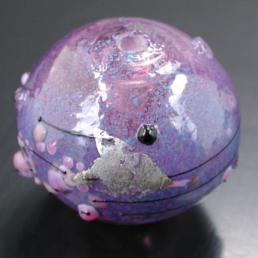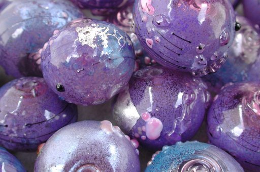 Like the sky blue beads, these are typically made on a clear or pale purple (any of 080, 082, or 046). These are shown with silver leaf, and that's typical, but they look nice with any metallic leaf (except copper, I guess...) They're usually trailed with fine black threads but not always; sometimes I put pixie dust on them.