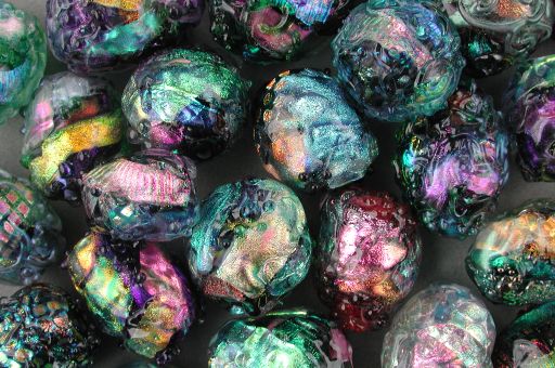 Dichro comes in many colors and patterns, and in these beads, I use ’em all. Like most of the beads I make, these are hollow, though they start out as slim cylinders before I add three to four layers of glass, sometimes with additional decorations of two or three kinds of leaf, reduction frit, and of course, dichro. Lately I've been softening the dichro with pixie dust.