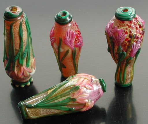 Well, I do have a garden, but have only started growing iris in the last 2 years; on the other hand, I've been growing crocus, which come in stripes and actually have this shape, since before I took up bead making. No-one who has iris growing in her garden could fail to be charmed by them, and I'd like to try representing them some day; but if the flowers on my beads have to be assigned a specific species, that's more or less how I think of them.