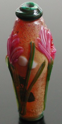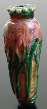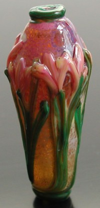 Needless to say, I cannot have claimed to have found the one true bead unique only to me. One of the reasons I've stuck with glass as long as I have is that when I get bored with one thing, I can bounce to another. However, my beads do fall into several categories—textured (frit, powder, leaf); trailed (dots, curliQs); dichro; and florals. Florals (the way I do them, anyway) are basically a form of fancy trailing, using striped cane. Pati Walton, Kristin Frantzen Orr, Leah Fairbanks and Kim Fields are all known for their trailed florals.