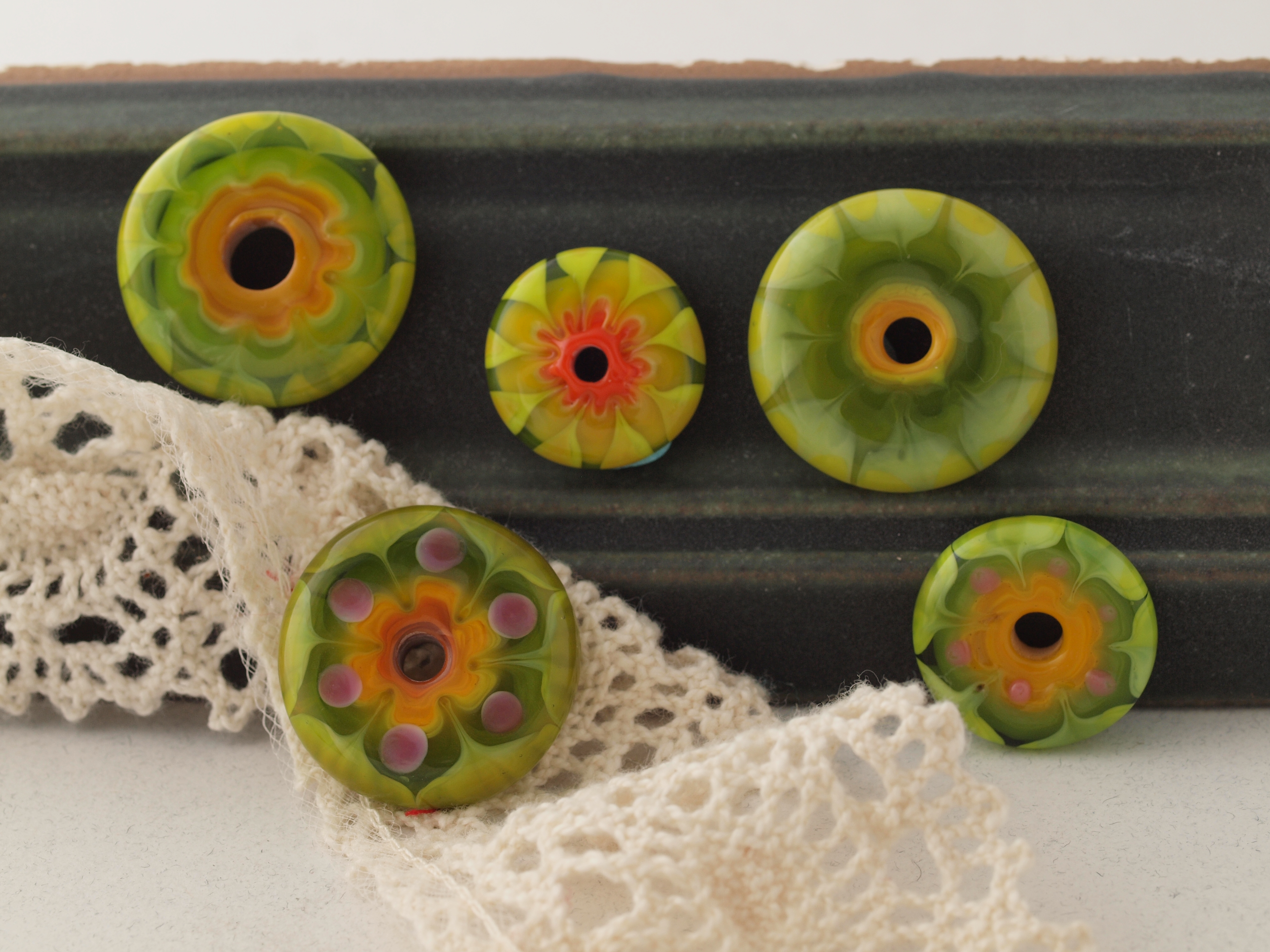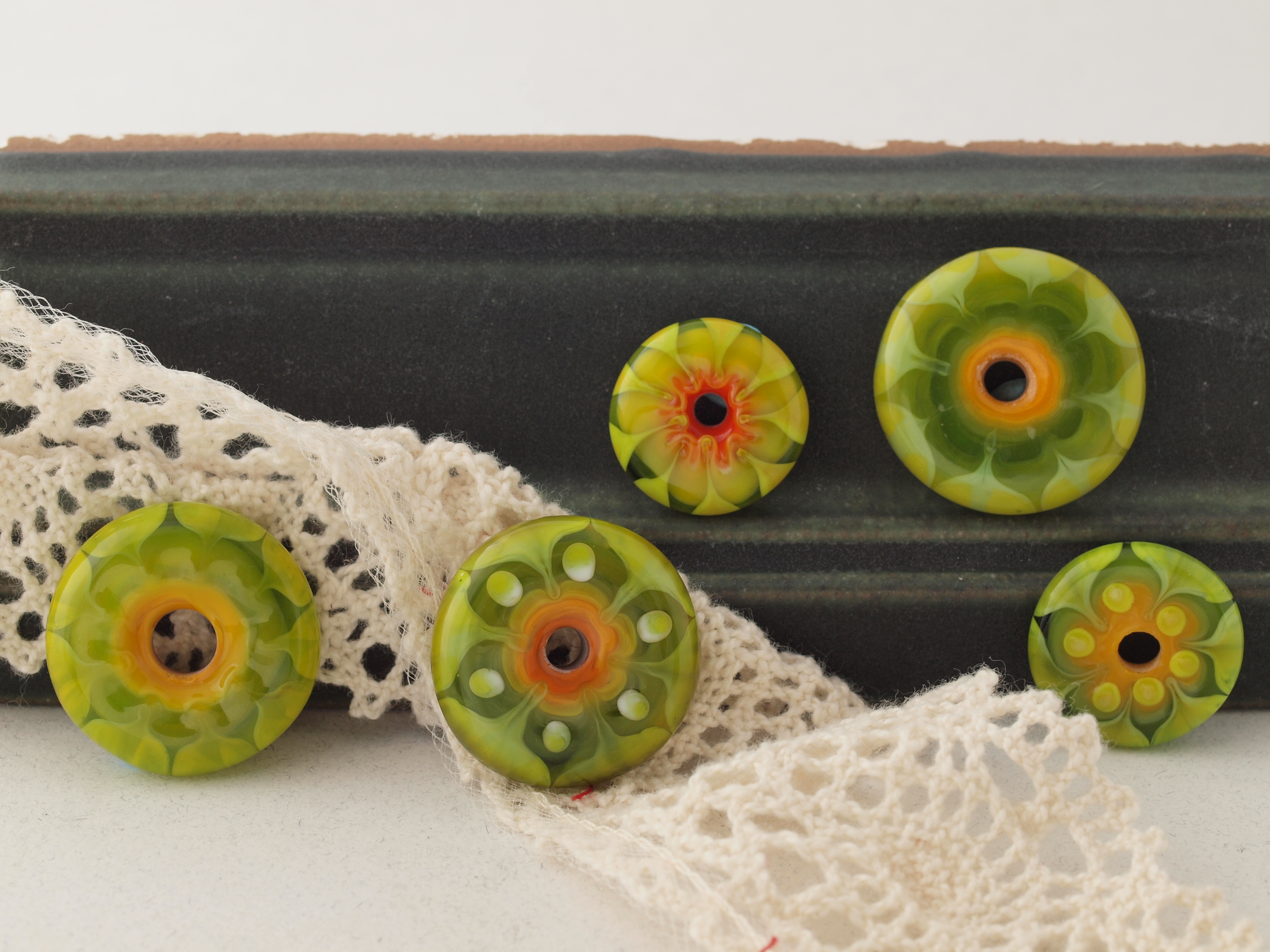 5 raked disks in bullseye. I decided to have some fun with the background—since this is a putative St Patrick's Day post, I put in some lace and a dark green tile background so as to prop up the beads. They're shot with the E620, roughly f8 at 1/120sec with the flash set to quarter power.