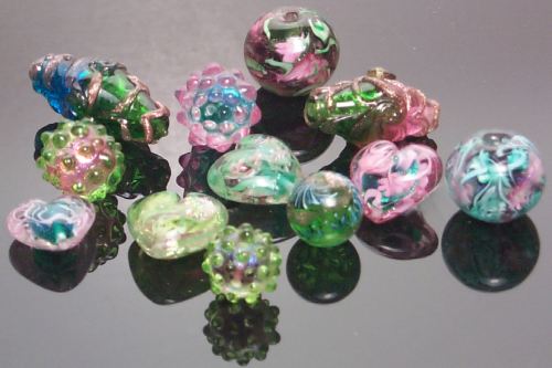 Shown below are some of Peggy's signature beads: hearts, of course, sputniks (dot trailed dichro beads), aventurine trailed bicones, and beautiful marble like beads with Peggy's hand-twisted filigrana cane. Peggy has a real gift for using tools, and a very good eye for judging the volume of marble molds. Like me she started out as a stringer, so her beads are designed with that in mind; in addition to making and teaching the making of glass beads, she also makes beautiful wire-wrapped jewelry (and teaches the techniques) and sings.