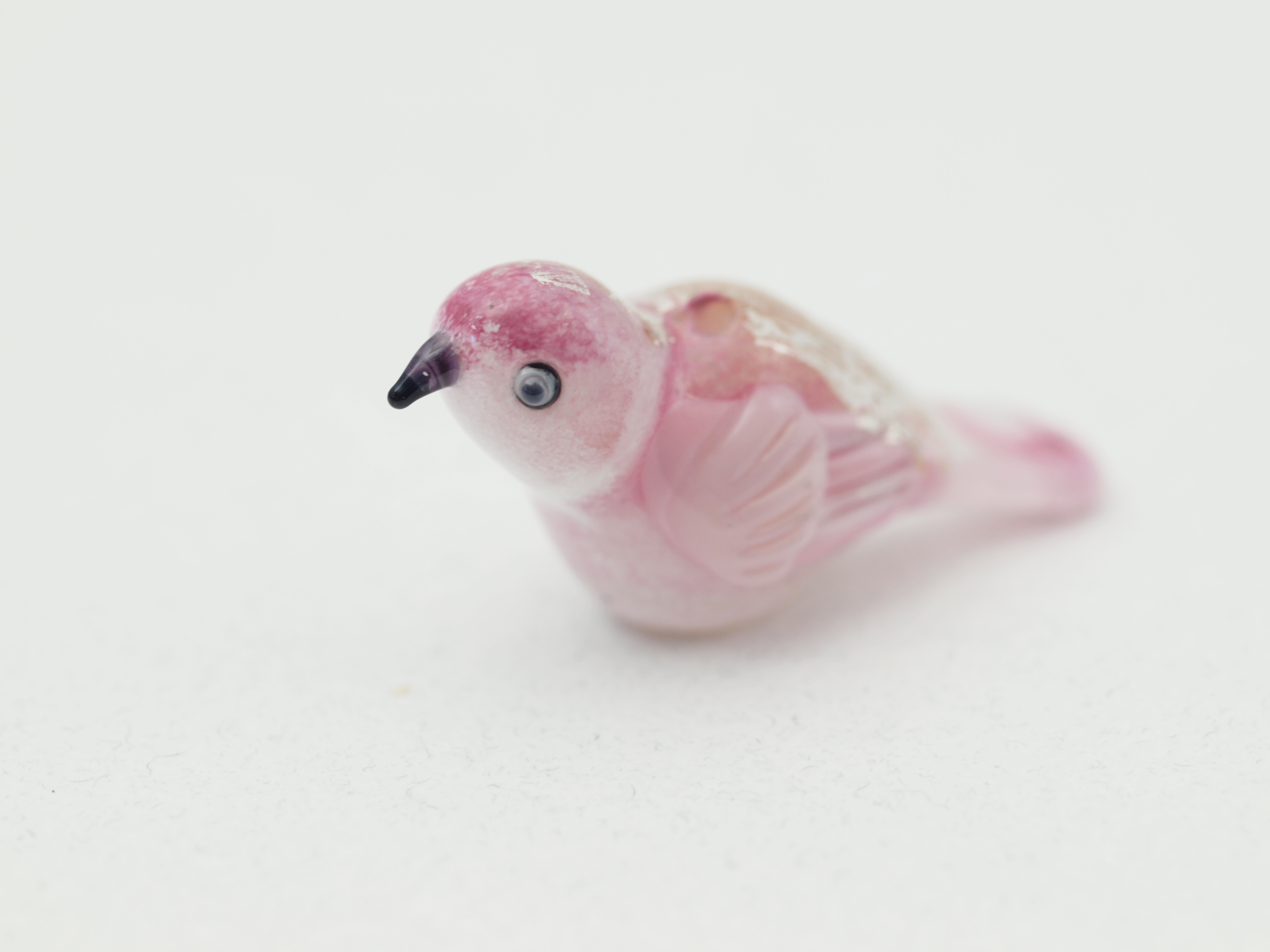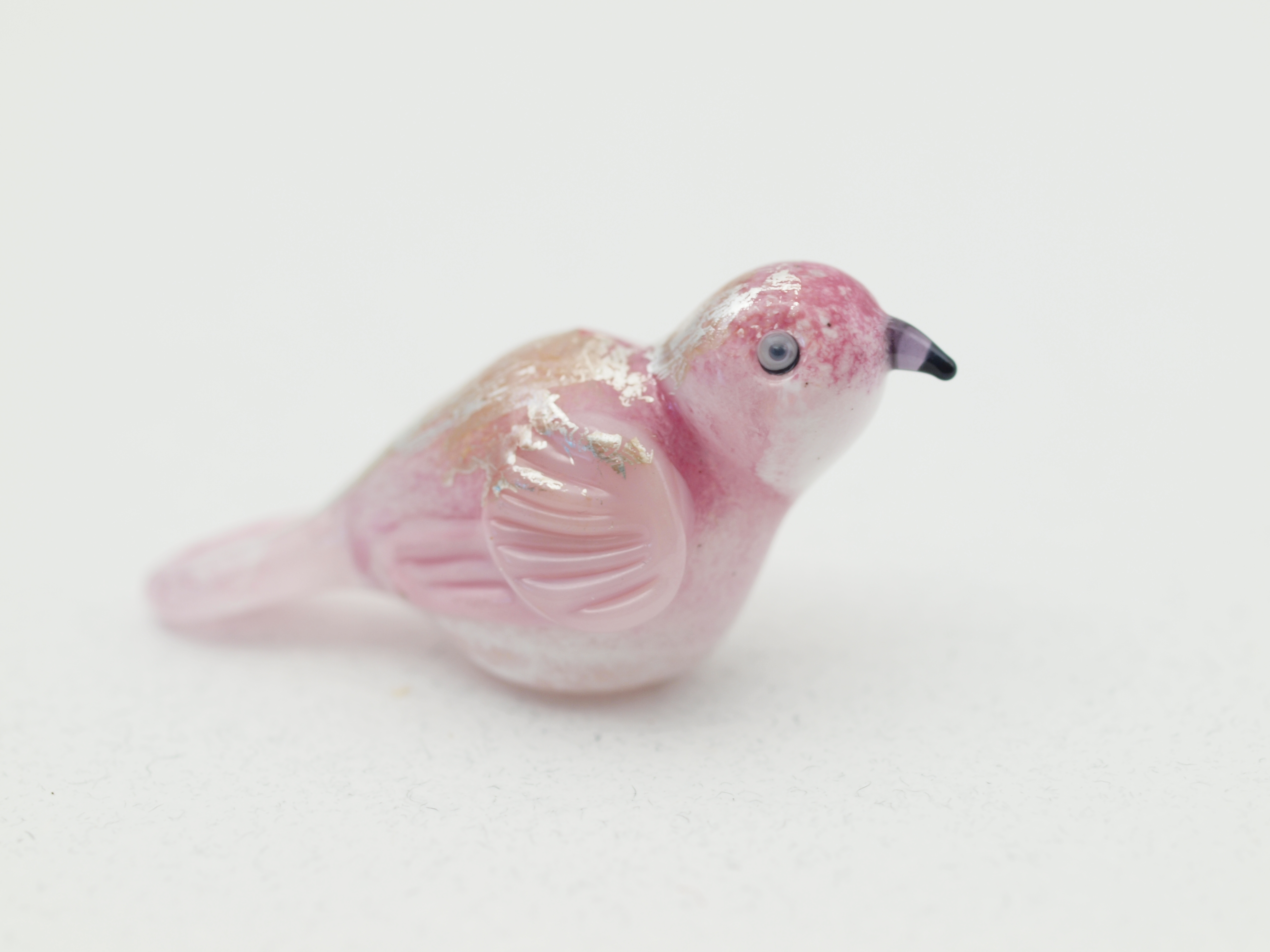 The pink birdies were a hit: Page asked me to make one with silver leaf. I was a tad on the dubious side, because silver dissolves very readily in glass, and stains it yellow (which indeed happened.)