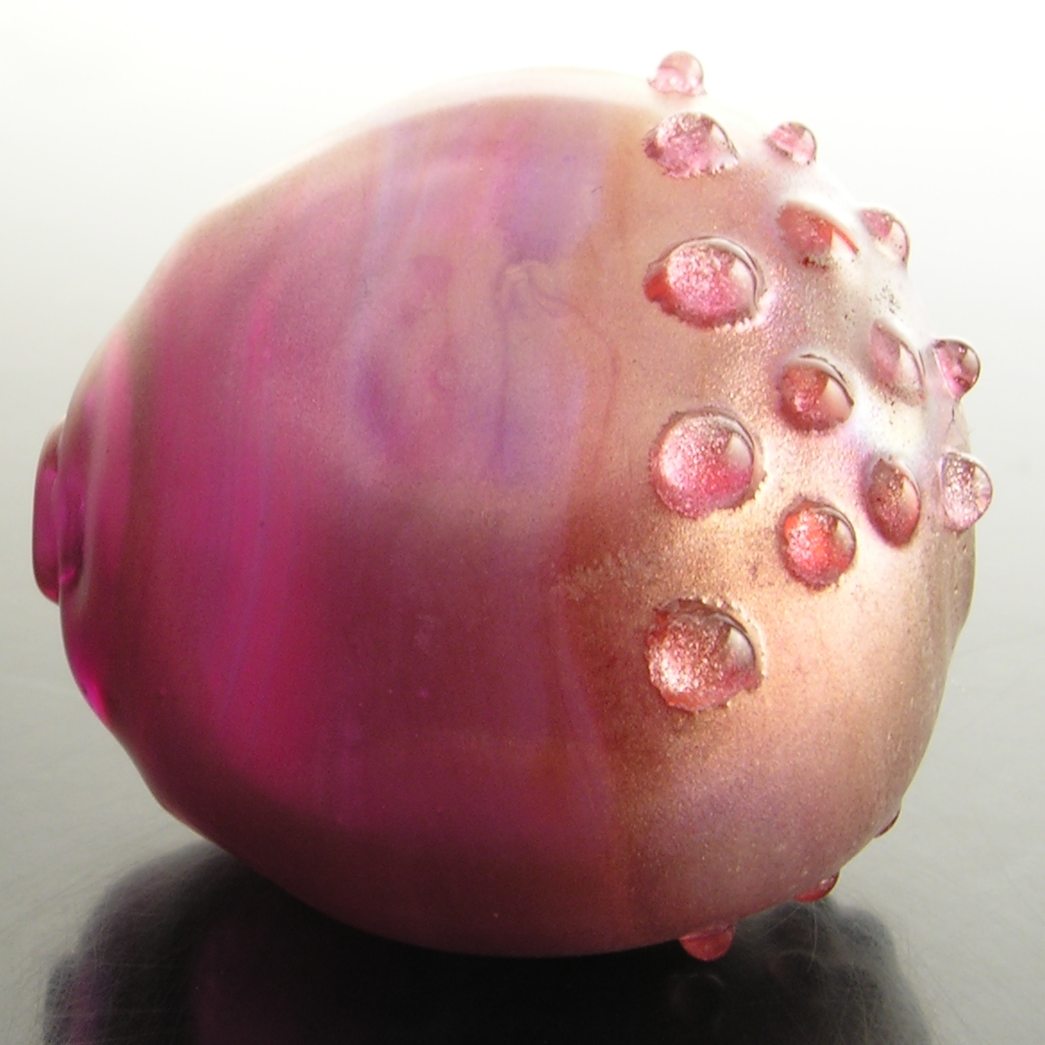 So I made a series of pink pixie beads out of some the odd-lot pink Lauscha. This one has some interesting color variations, partially from (carefully!) cooking the pixie dust but also because I made the two halves of the bead from different colours. Even so, the one on the left side (bottom, undotted) part of the bead struck differentially in the flame, yielding those blue bands, especially near the midline, or equator of the bead.