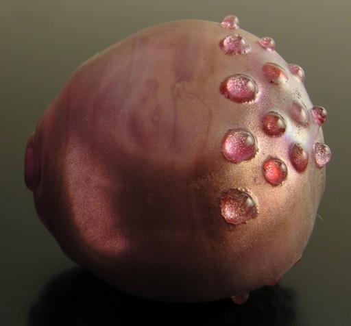 This view of the bead reflects the underside, and emphasizes the subtle gold and delicate favrile qualities of the pixie dust at the expense of the bead's overall transparency.