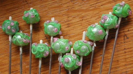 I was exhausted and had a splitting headache when I made these. I didn't really know what to do, so I took some shorts and made a leaf cane of medium opaque turquoise ribbed on white, pea or nile green ribbed on the turquoise, and filled in (cased) with grass green. It wasn't very exciting, so having admired all the flowers—both in the beadwork and outside my window—I decided to make some little bracelet sized rounds with it. I wanted something vaguely curliQ like.