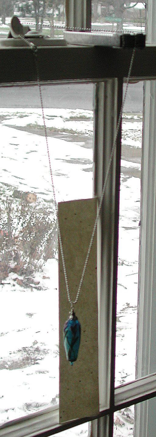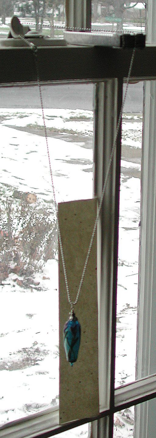 The chain is hanging from the window lock and a leatherman tool balanced on the window ledge. The diffuser is a scrap of card stock left-over from cutting some business cards apart (had to print some up for my latest bead-store appointment). If you compare the setup shot to the picture below, you'll see the bead is more evenly lighted: I held up a white paper bag opposite the window to bounce light back on the bead. Not shown is the tripod; also, I took about 8 shots of this, from e.v. +1.3 or so to -0.7, and ended up using the lightest one.
