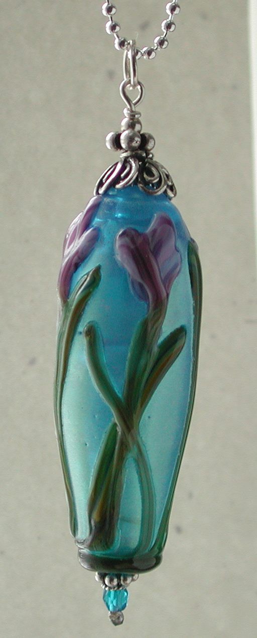 pixie floral vase, 09dec03. It's probably about 28–30 MM long, and hollow. Pixie dust, effetre, sterling silver, czech fire-polish. Private collection.