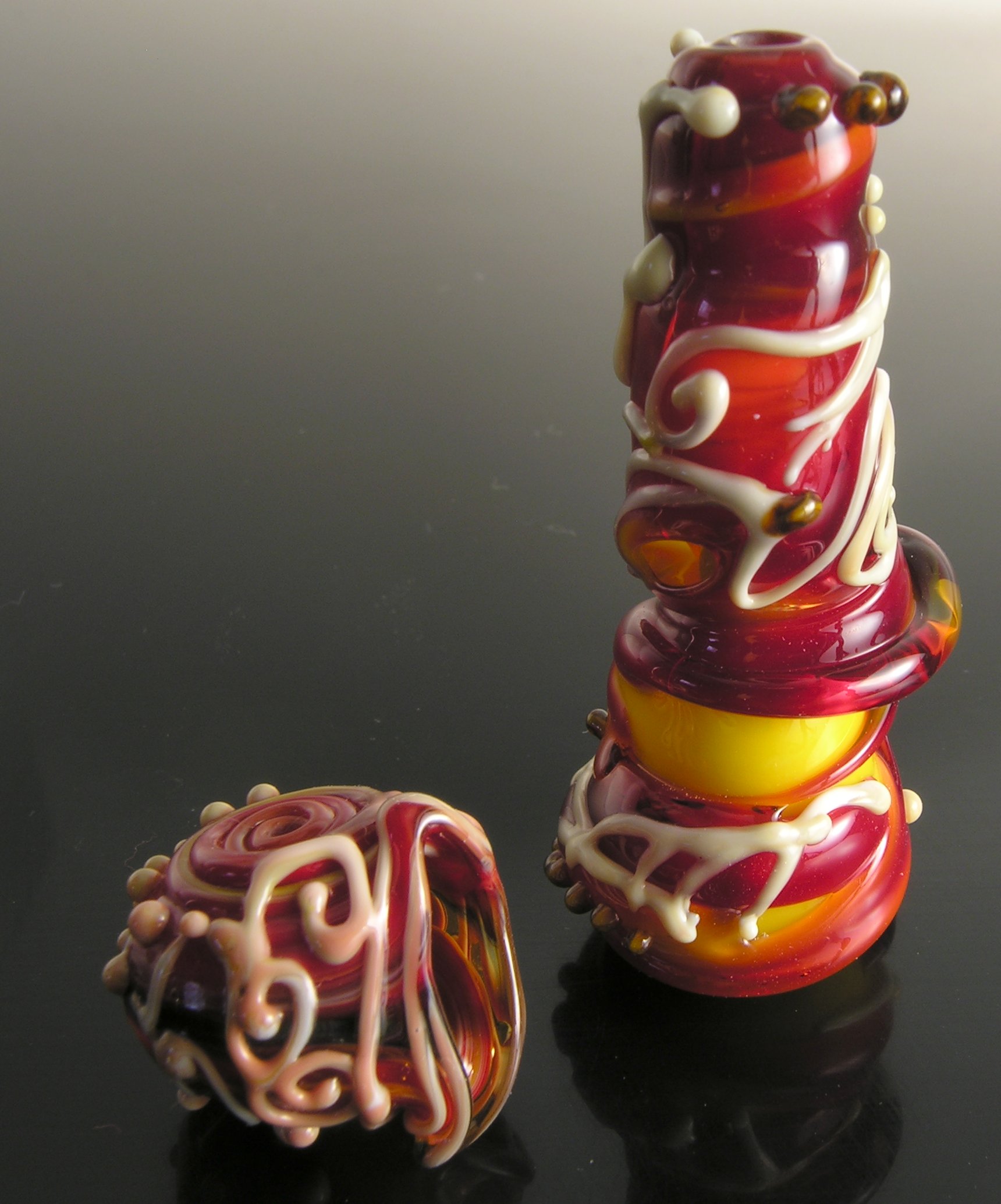 Anyway. The bead on the left is a holepop, which I've always maintained has great potential for stringing. The one on the right is admittedly a hot mess, but clever beadworkers have found a way even to enjoy those (i.e. Joella's ‘tantrum’ beads, but alas, my google-fu is not turning up many good examples).