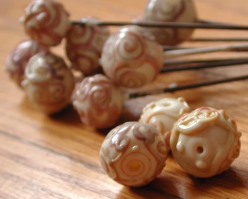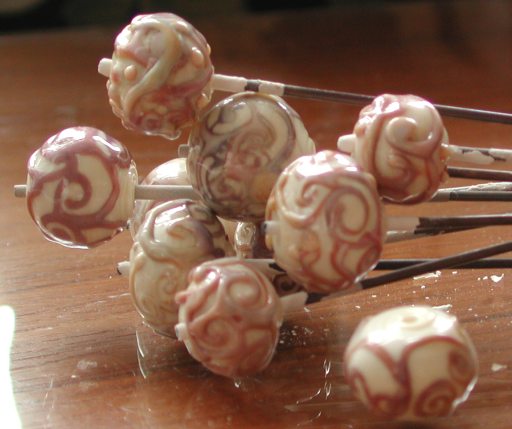 The beads shown on this page are hollow ivory (don't recall whether dark or light) with silver pink trailing. (I had a bunch of unlabeled stringers made of silver pink and opal yellow; the opal yellow strikes to sort of a brown, as far as I can tell, though I didn't realize that till after I'd taken this photo; the silver pink does the pink/purple thing.) I still can't tell you how to get purple rather than pink, except to suggest that in amber-purple, you get it by repeated heat-cool iterations, and I note in my own beads the most worked areas tend to be the bluest.