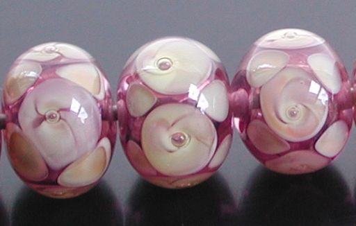 Ms. Logan makes her base bead with a careful application of lapping cylinders, a technique she says she developed to cope with fragile bead release (presentation, Gathering 2003), and which she also uses to stunning effect on her plain dot-beads which are actually cased.